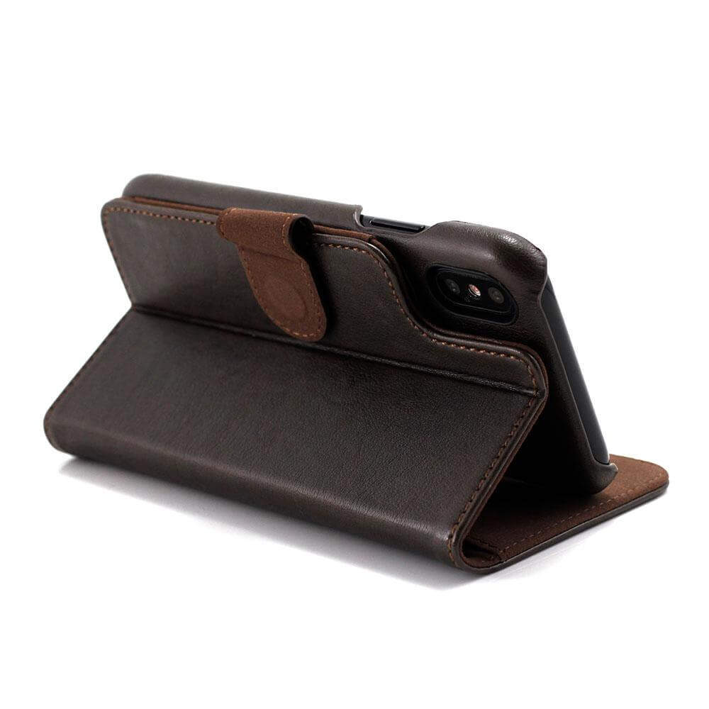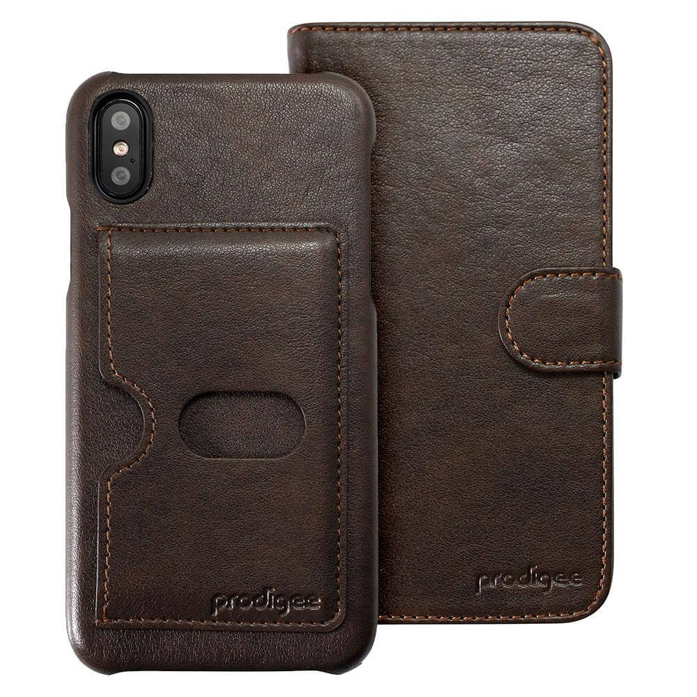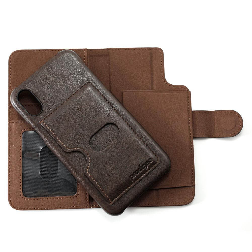 Prodigee Wallegee Case - кожен калъф, тип портфейл с отделящ се кейс и поставка за iPhone XS, iPhone X (кафяв)