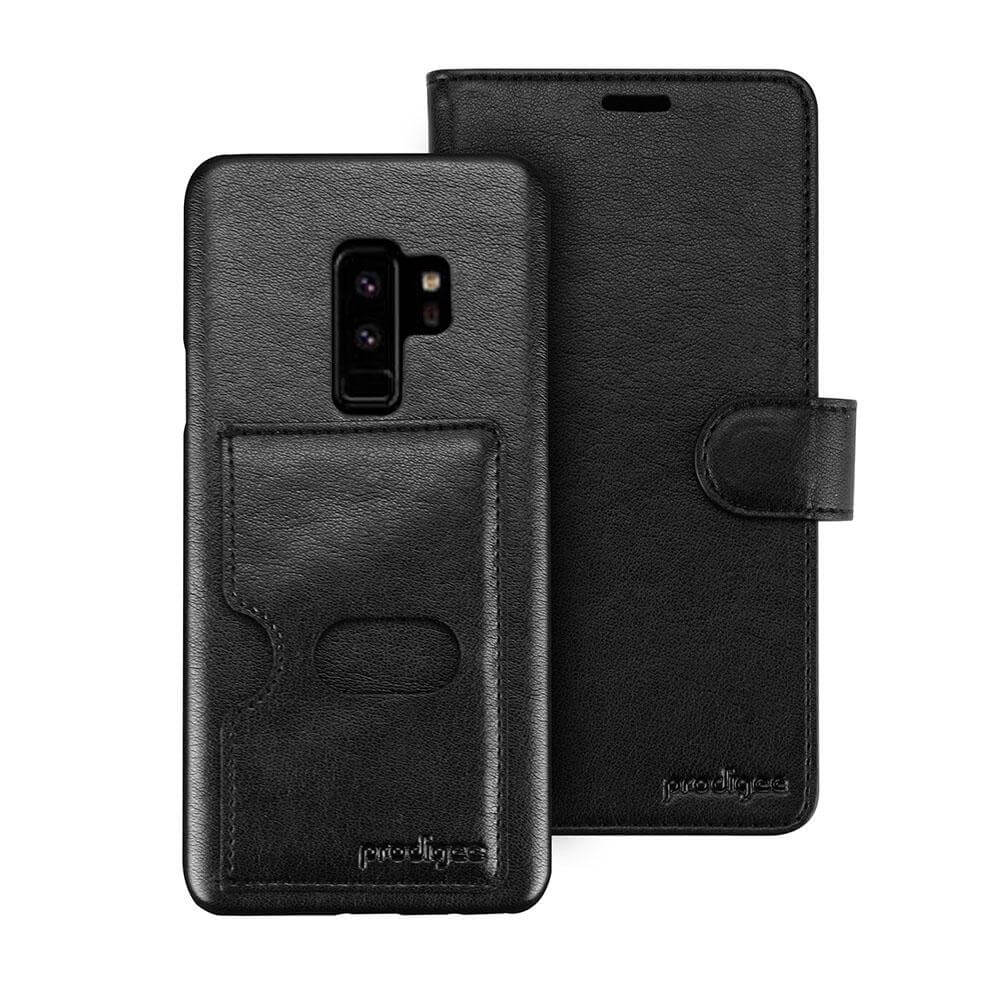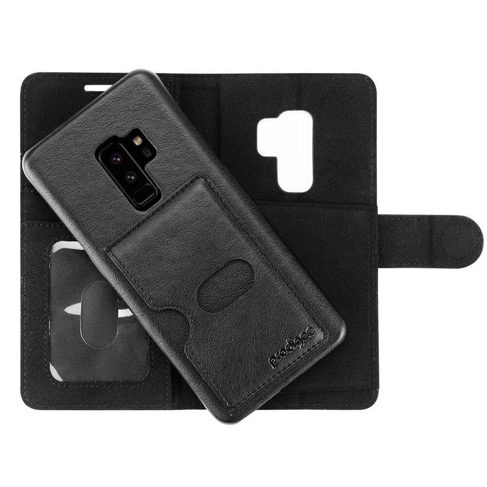 Prodigee Wallegee Case - кожен калъф, тип портфейл с отделящ се кейс и поставка за Samsung Galaxy S9 Plus (черен)