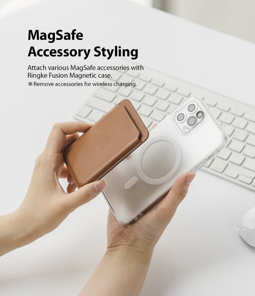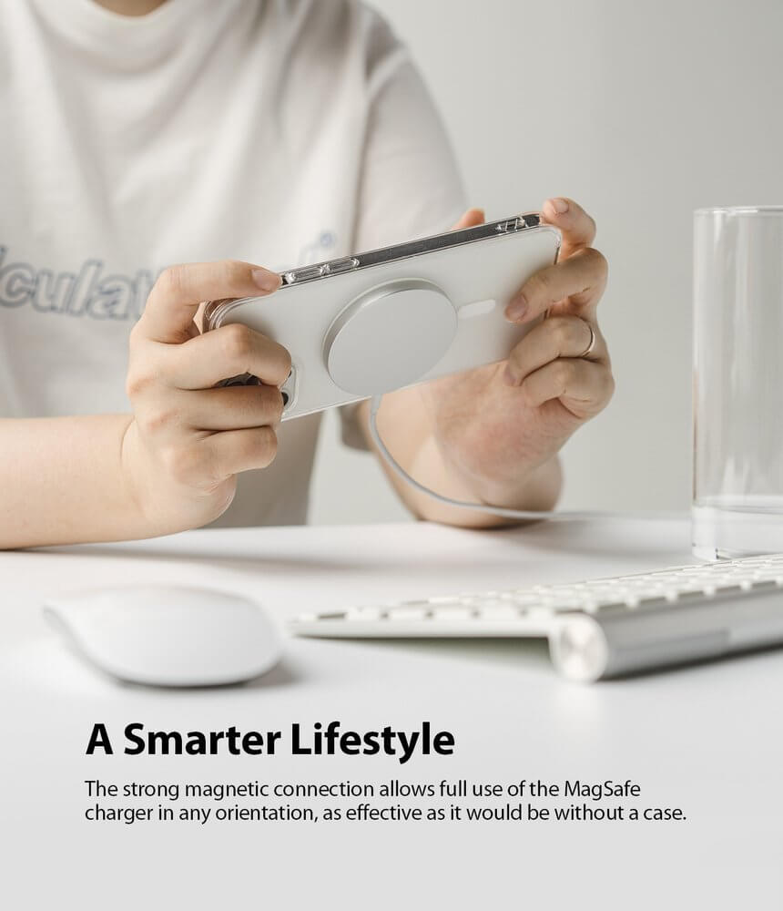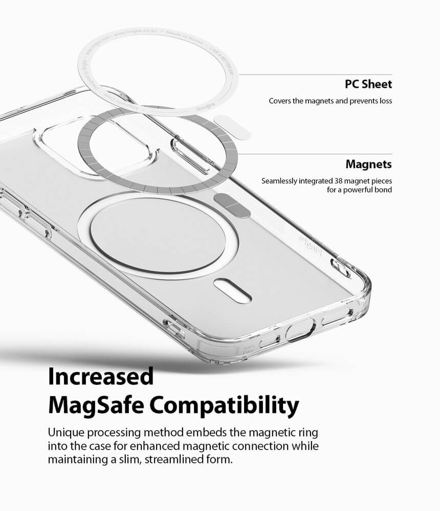 - Калъфът е снабден с магнит, благодарение на който е съвместим с MagSafe аксесоари. Това е изцяло нов стандарт за бързо и лесно свързване на аксесоари и безжични зарядни устройства