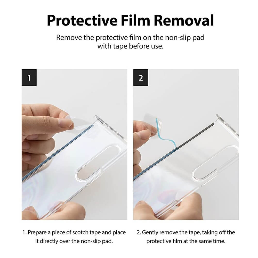- Внимание: преди да поставите предната част на кейса към телефона, премахнете тънката предпазна лента, която покрива противхлъзгащата повърхност. Това е необходимо, за да може повърхността да прилепне плътно към вашия телефон. По този начин се предотвратява отделянето на кейса от телефона при сгъване и разгъване
