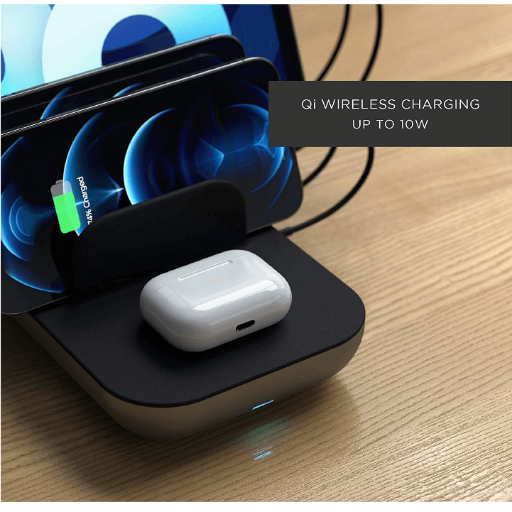 - Зареждане до пет USB устройства едновременно - с Qi постаква за безжично зареждане (до 10W), два USB-C PD порта (до 20W всеки) и два USB-A порта (до 12W всеки)