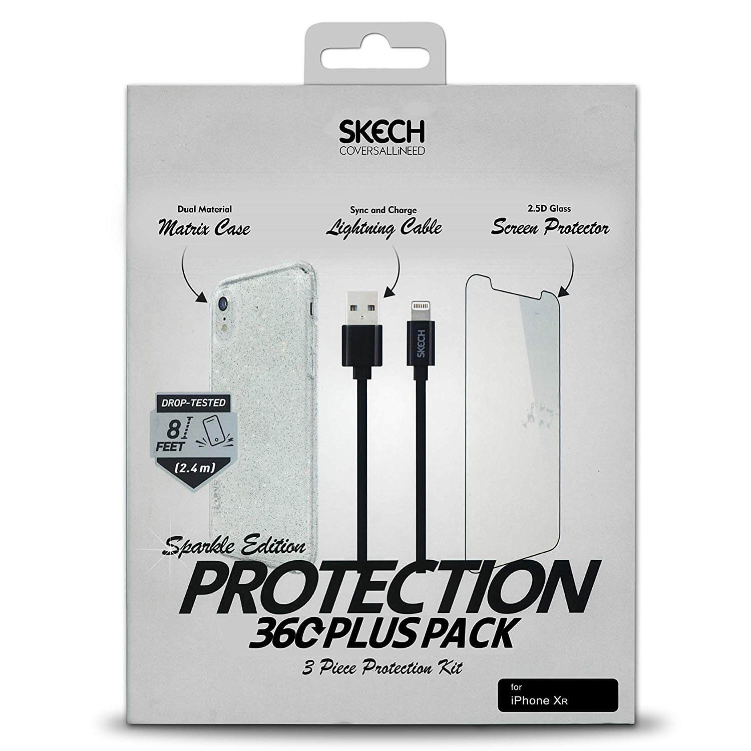 Skech Protection 360 Plus Pack - комплект удароустойчив кейс, стъклено защитно покритие и Lightning USB кабел за iPhone XR (брокат)