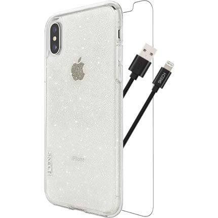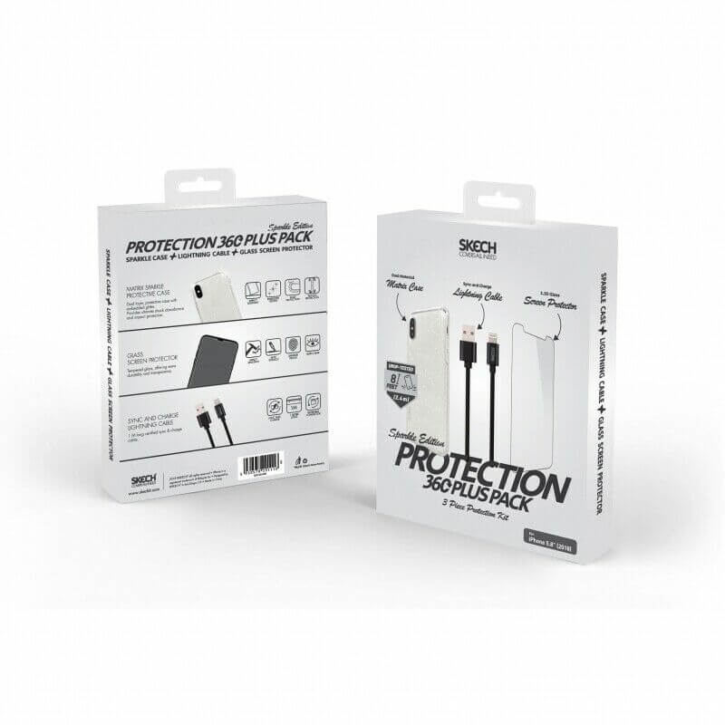 Skech Protection 360 Plus Pack - комплект удароустойчив кейс, стъклено защитно покритие и Lightning USB кабел за iPhone XS, iPhone X (брокат)