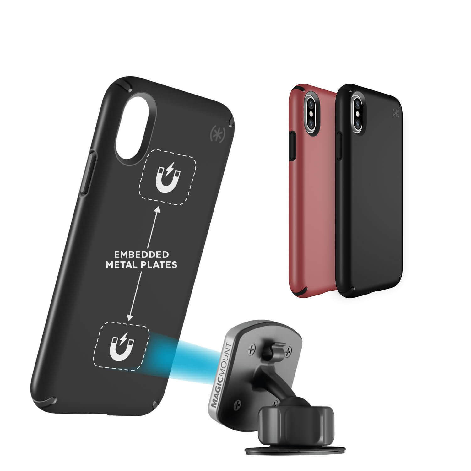 § Mount кейса разполага с две вградени стоманени плочи, намиращи се между външния поликарбонатов слой и вътрешния TPU слой. Тези плочи позволяват на кейса да се закрепи за различни магнитни повърхности.