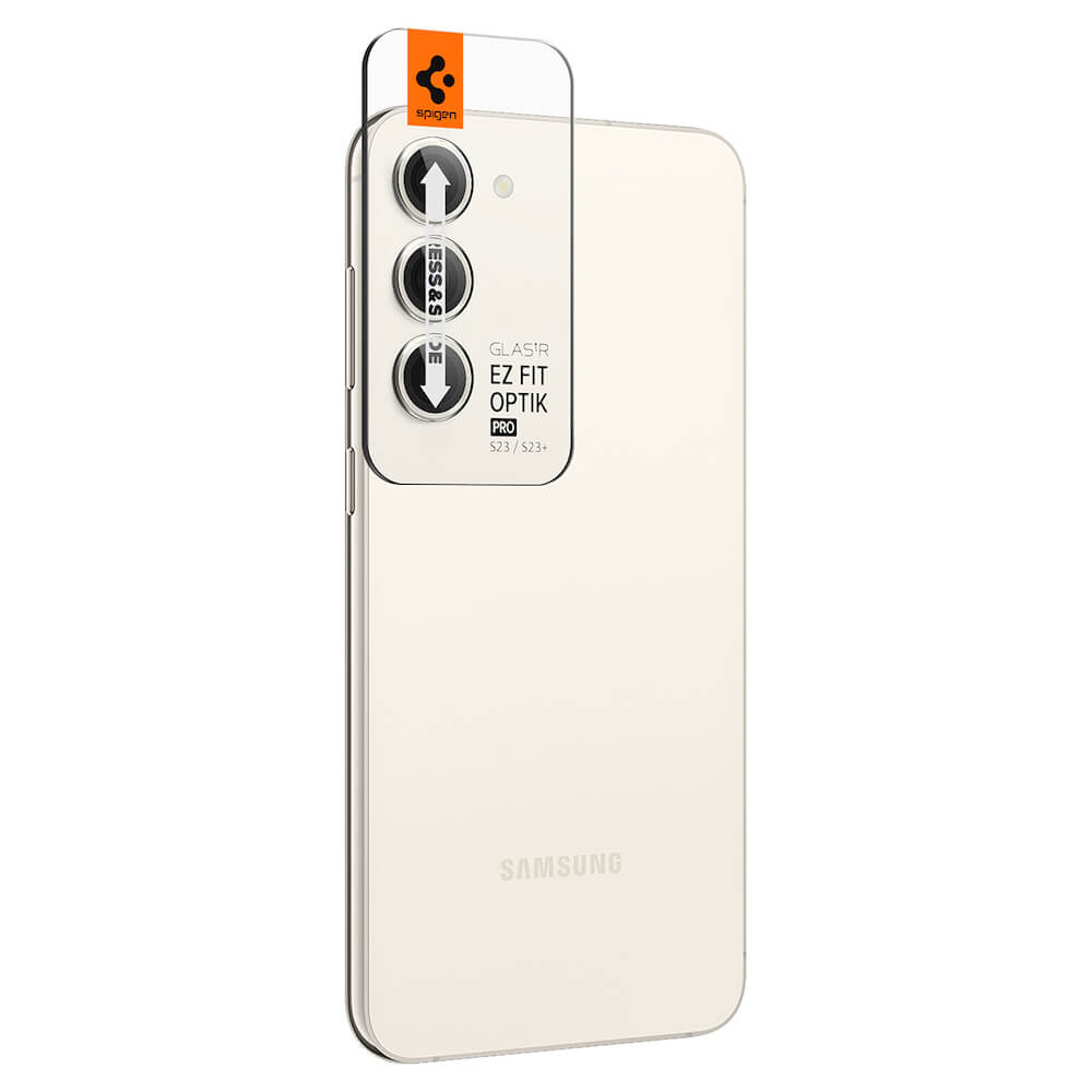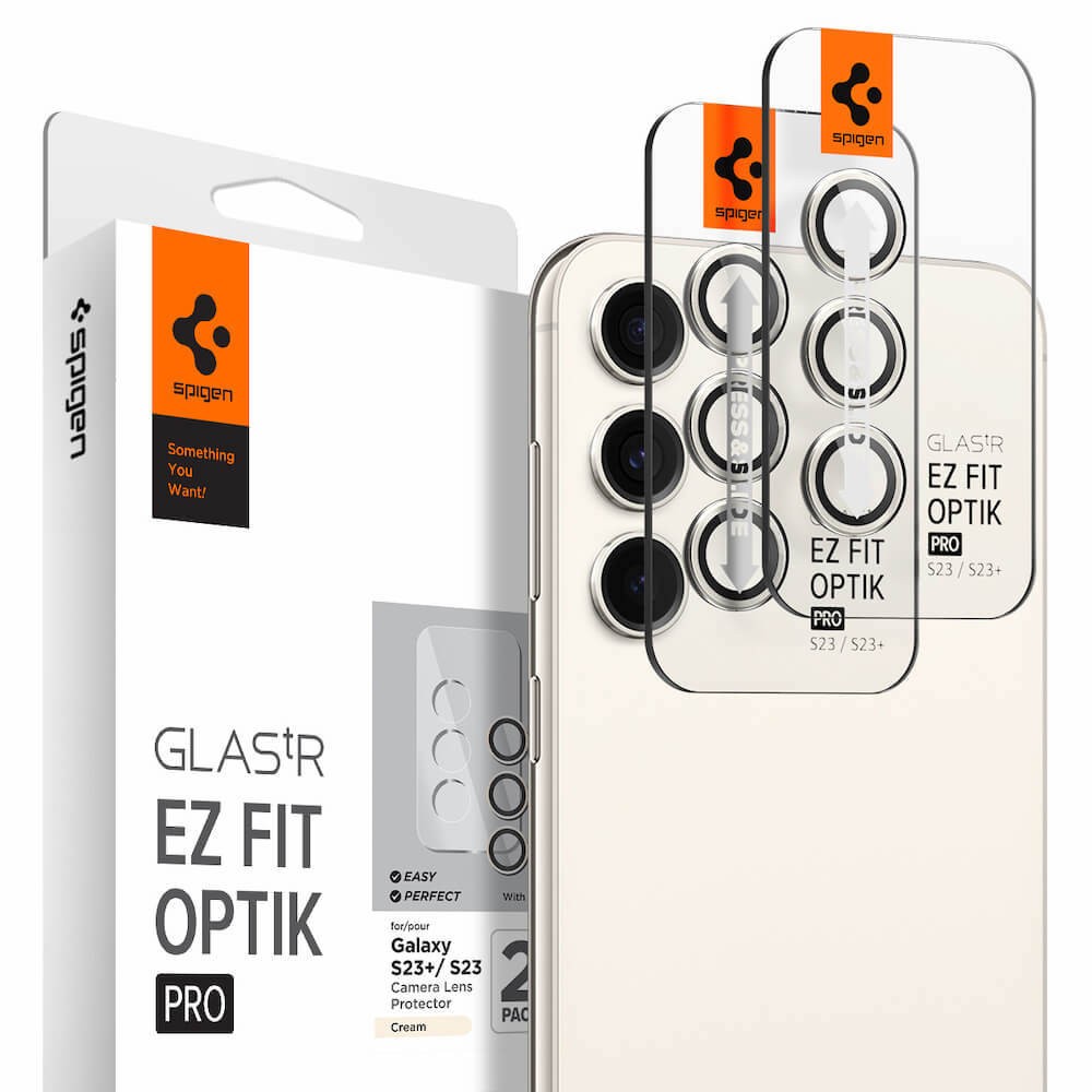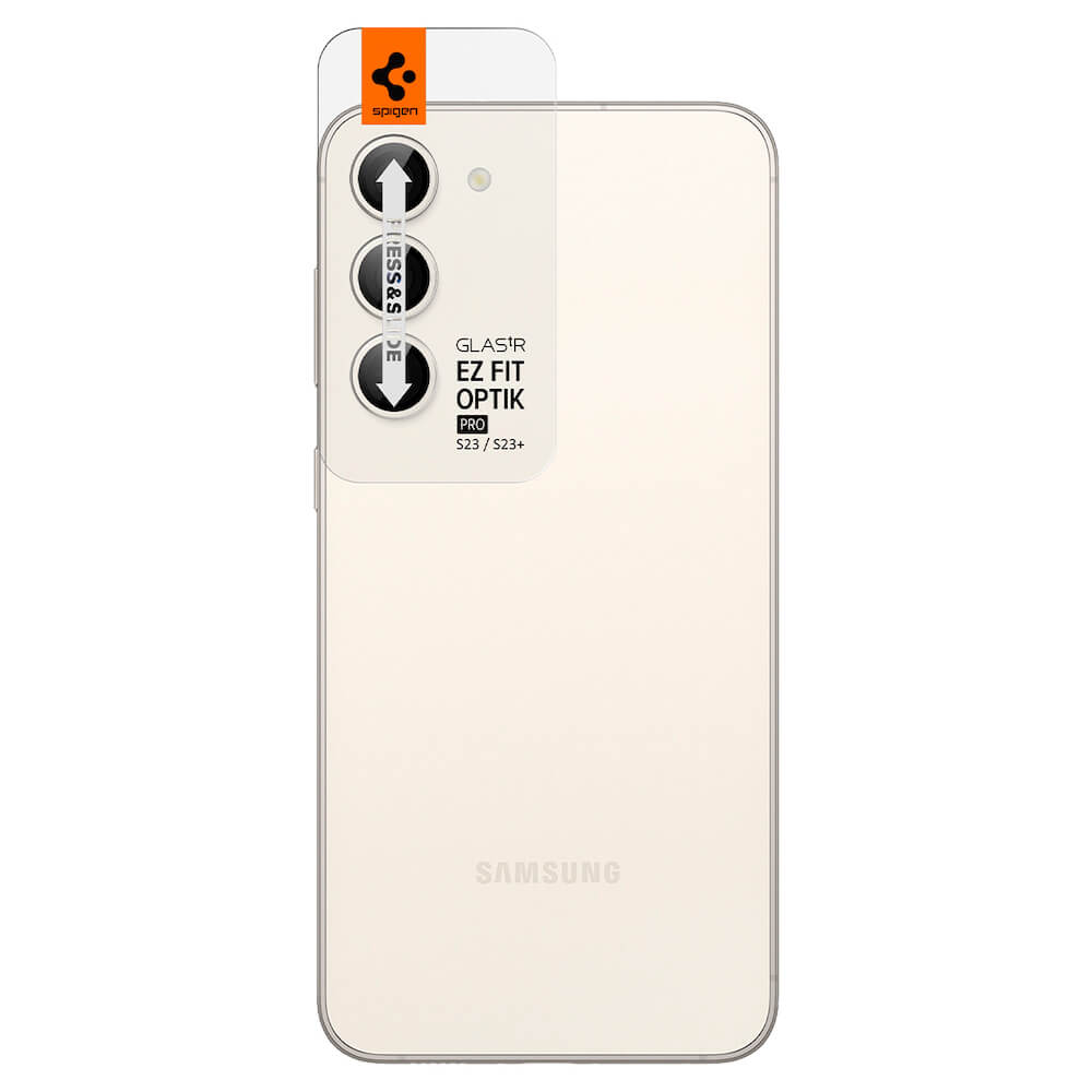 Spigen Optik Pro tR Ez Fit Lens Protector 2 Pack - 2 комплекта предпазни стъклени лещи за камерата на Samsung Galaxy S23, Galaxy S23 Plus (бежов)