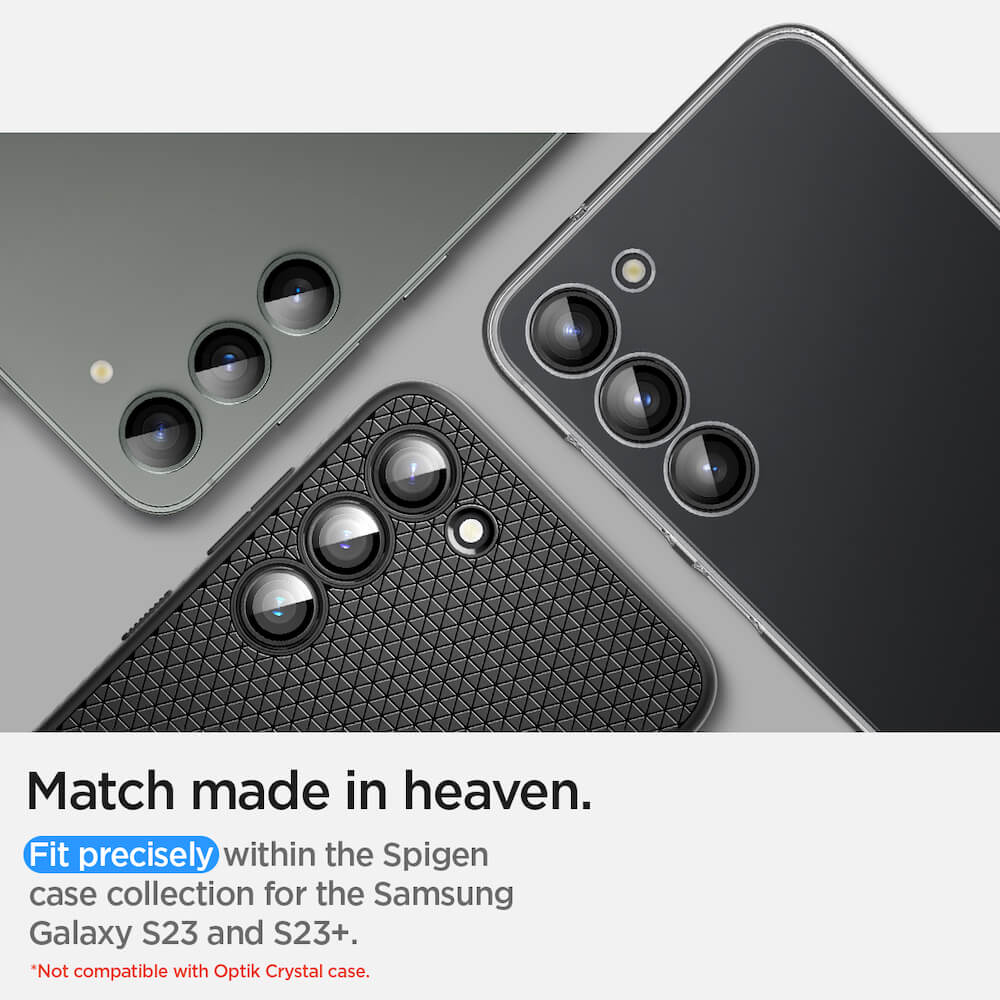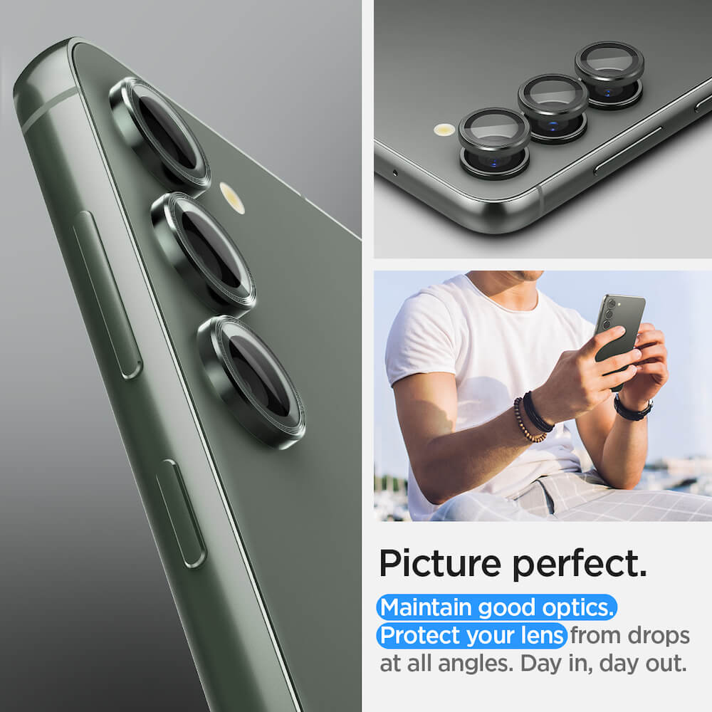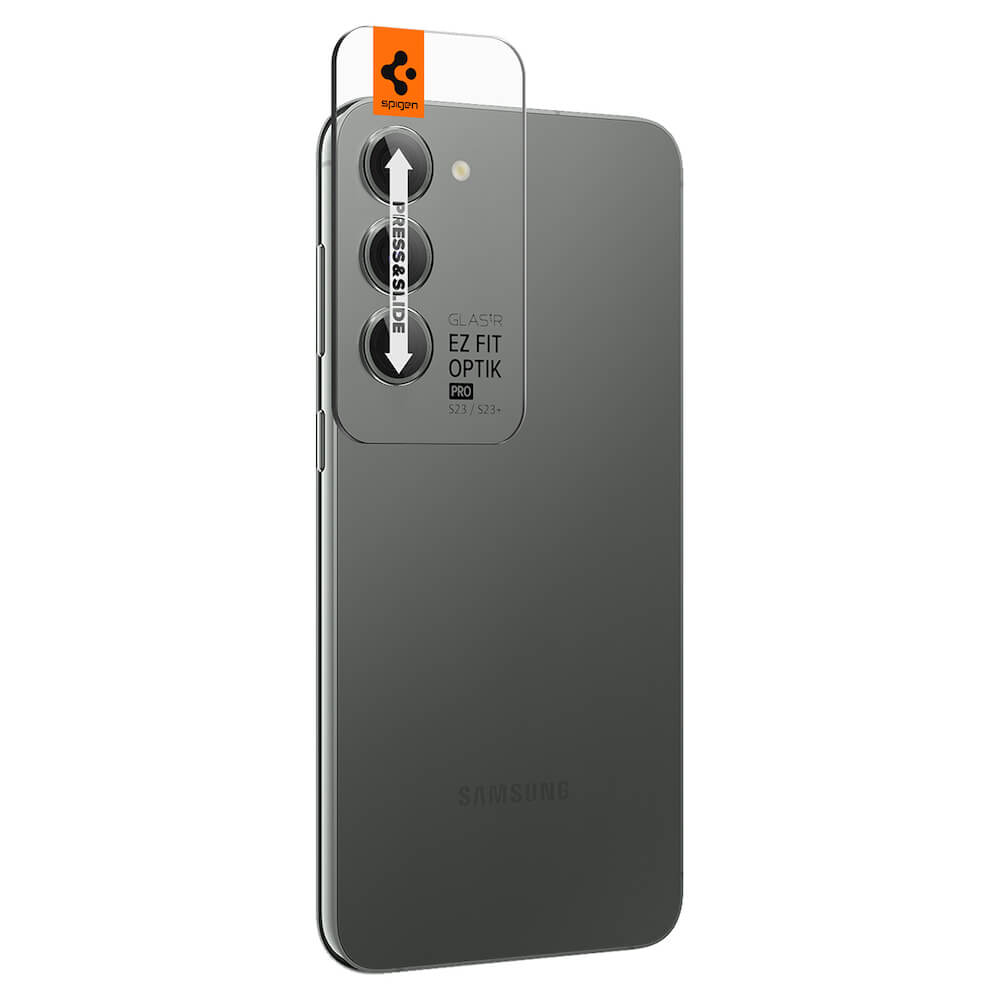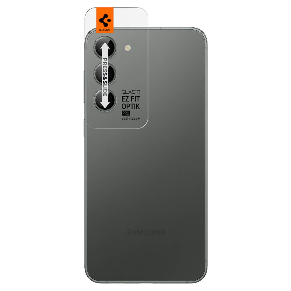 Spigen Optik Pro tR Ez Fit Lens Protector 2 Pack - 2 комплекта предпазни стъклени лещи за камерата на Samsung Galaxy S23, Galaxy S23 Plus (тъмнозелен)