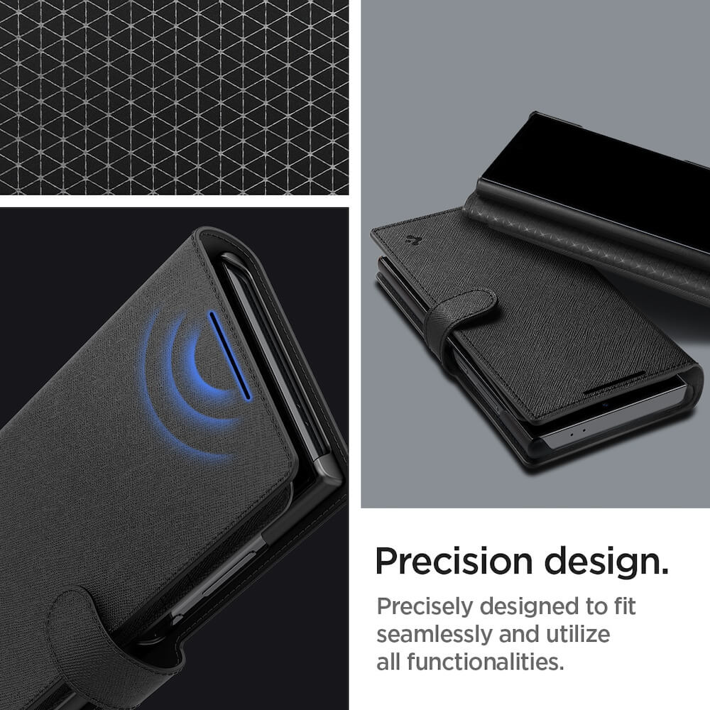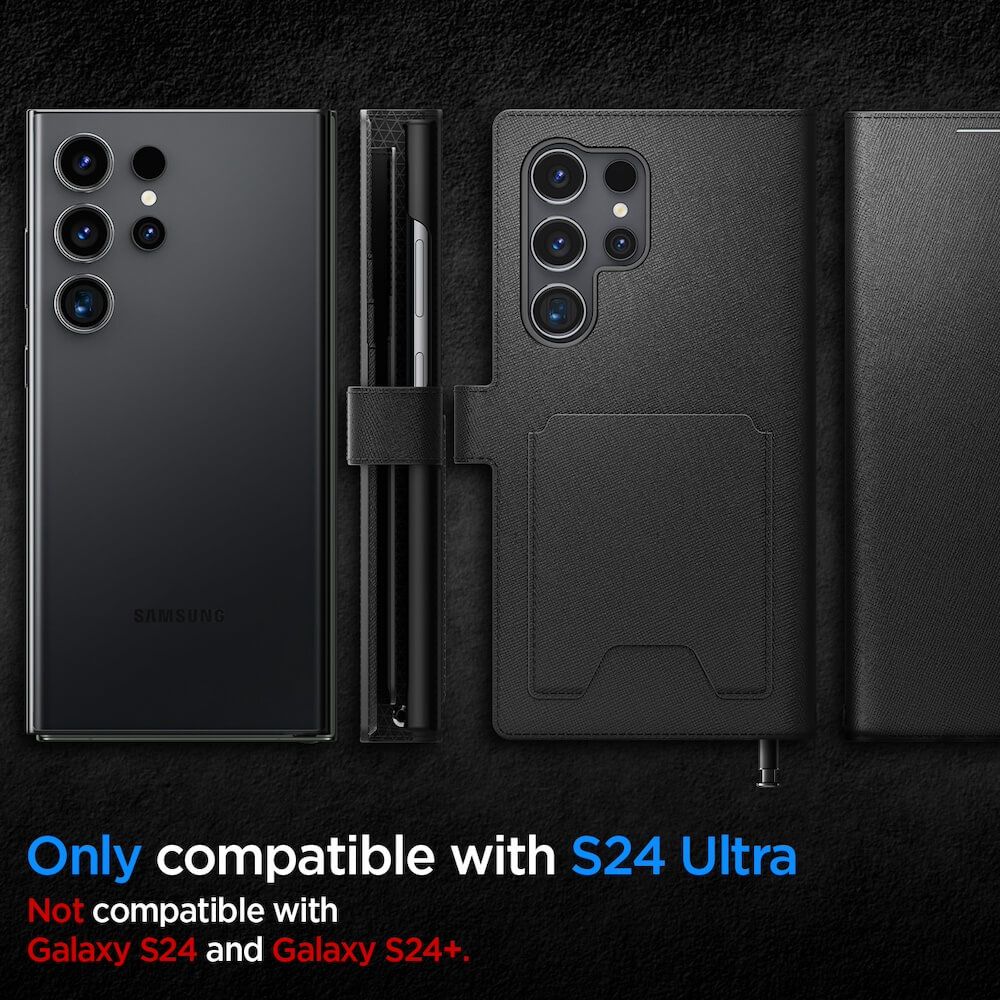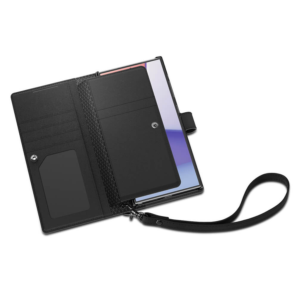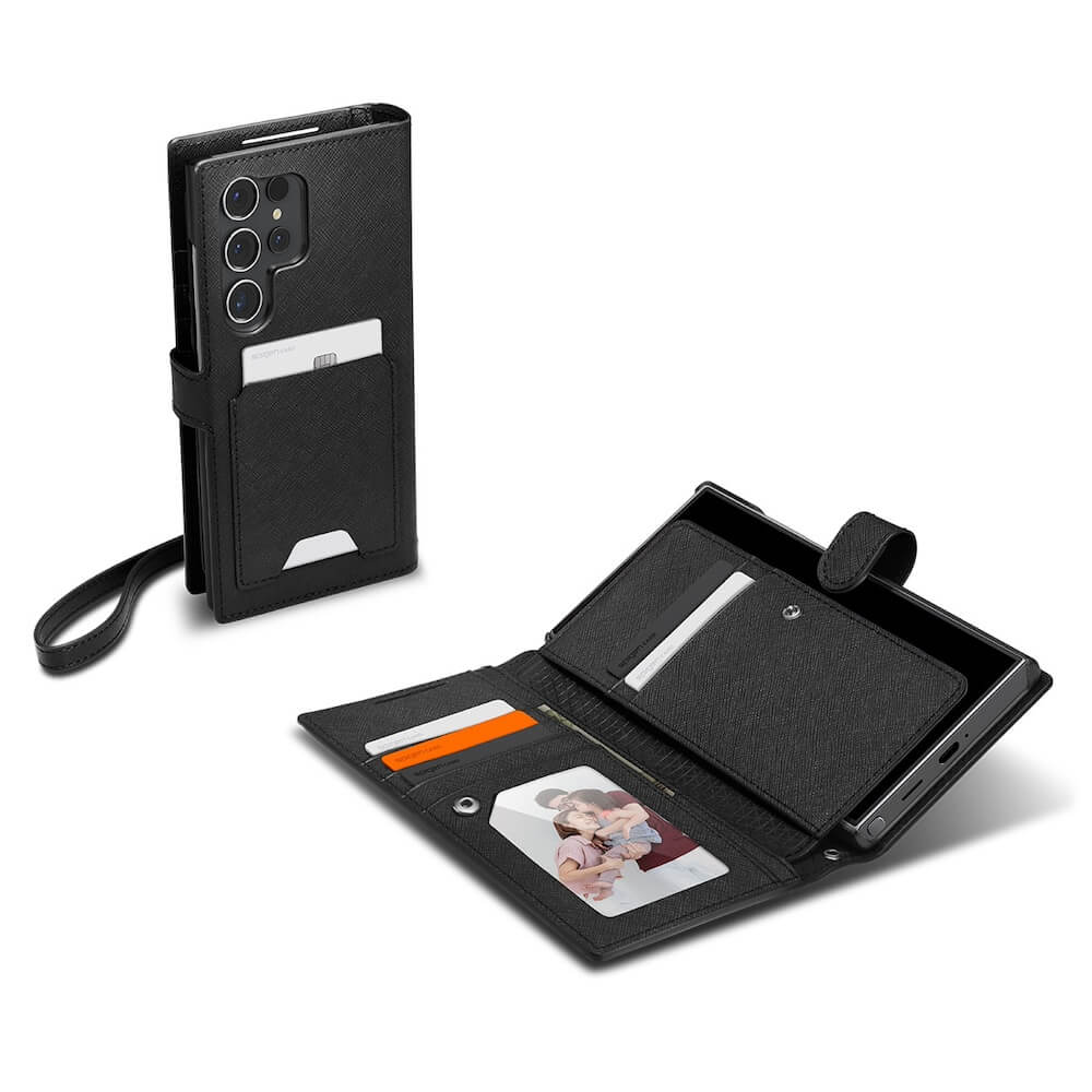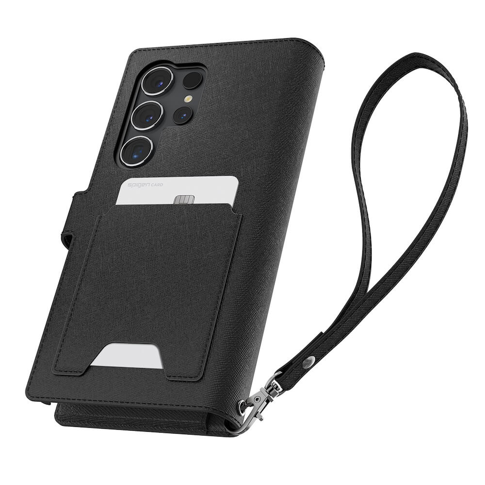 Spigen Wallet S Plus Case - кожен калъф, тип портфейл и поставка за Samsung Galaxy S24 Ultra (черен)