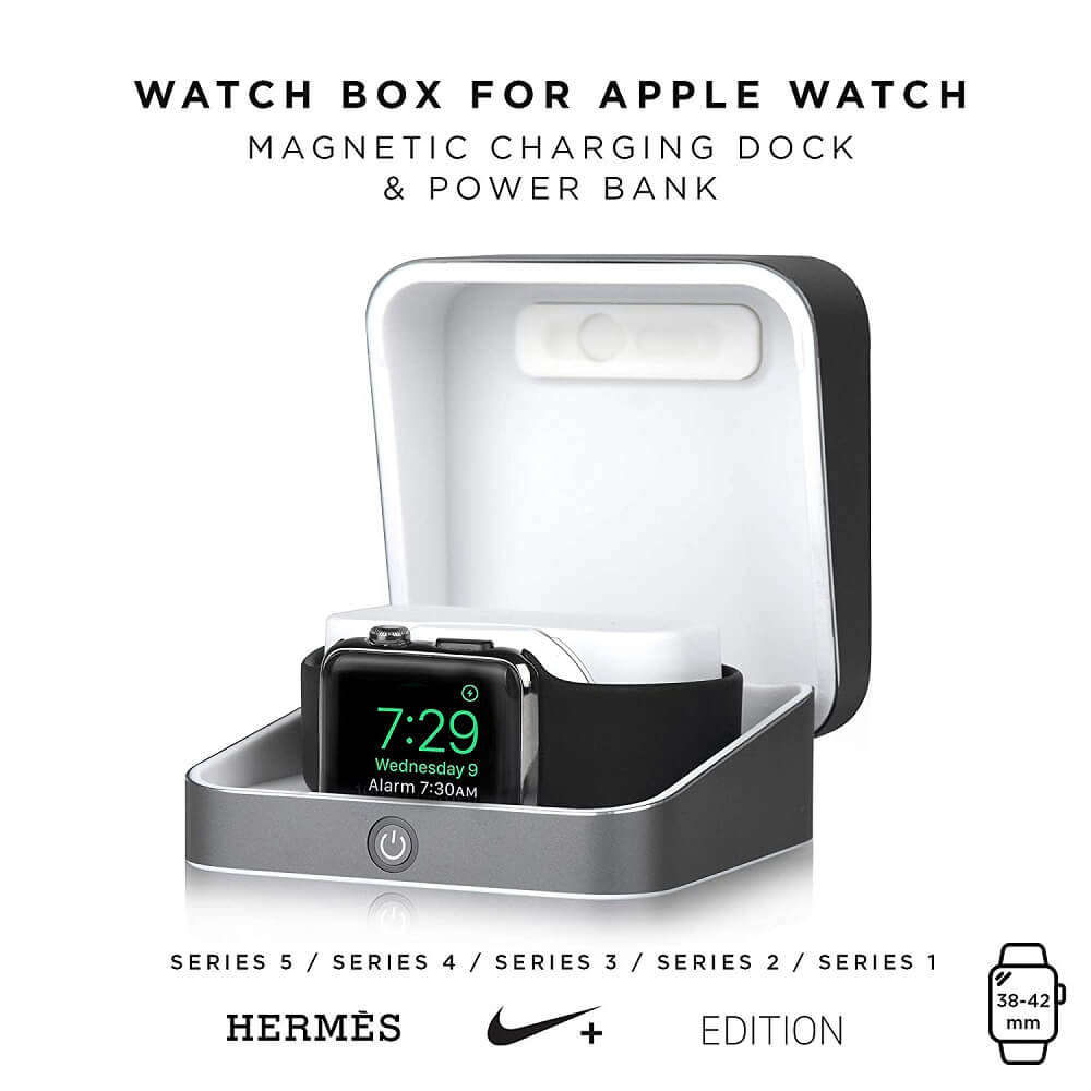 - WatchBox се предлага с разглобяема, сертифицирана, магнитна мини док станция за Apple Watch, която можете да извадите от кутията и да продължите да използвате