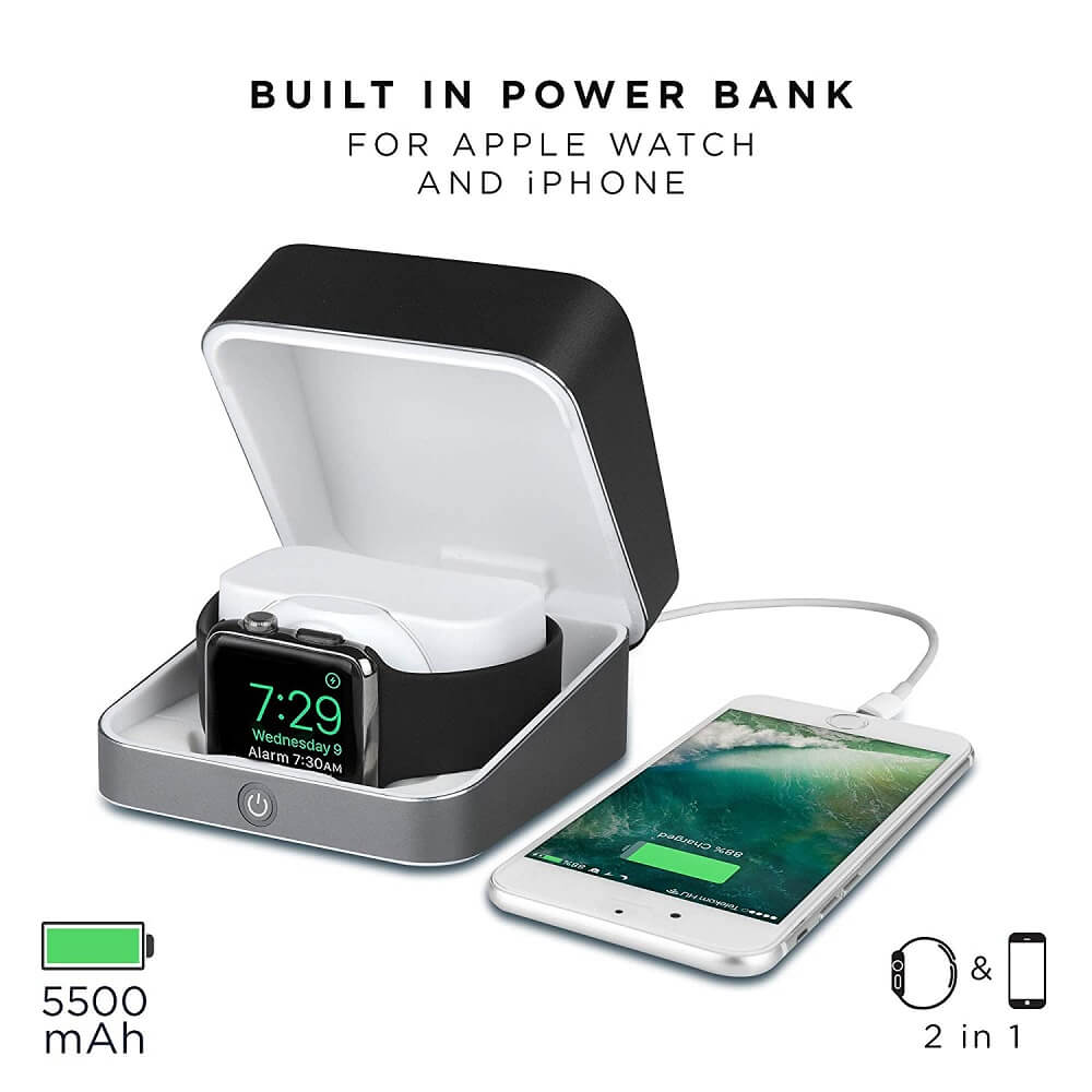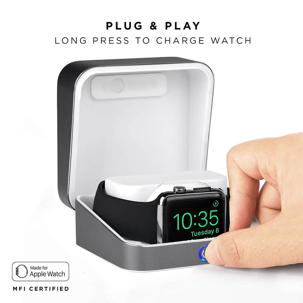 - Вградената батерия с капацитет 5000 mAh позволява на WatchBox да зарежда вашия Apple Watch до 10 пъти с едно зареждане. Използвайте USB кабел, за да презаредите WatchBox
