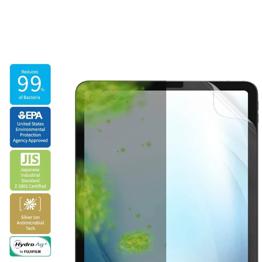 - Висококачествено защитно πокритие за дисплея на вашия iPad, с фабрично положен антибактериален слой със сребърни йони, който възпрепятства развитието на често срещани бактерии