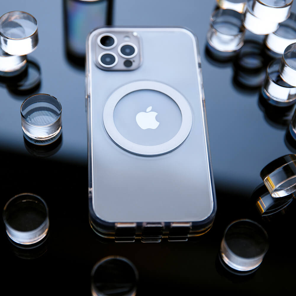 - Кейсът е снабден с магнит, благодарение на който е съвместим с MagSafe аксесоари. Това е изцяло нов стандарт за бързо и лесно свързване на аксесоари и безжични зарядни устройства