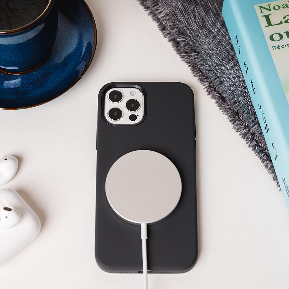 - Кейсът е снабден с магнит, благодарение на който е съвместим с MagSafe аксесоари. Това е изцяло нов стандарт за бързо и лесно свързване на аксесоари и безжични зарядни устройства