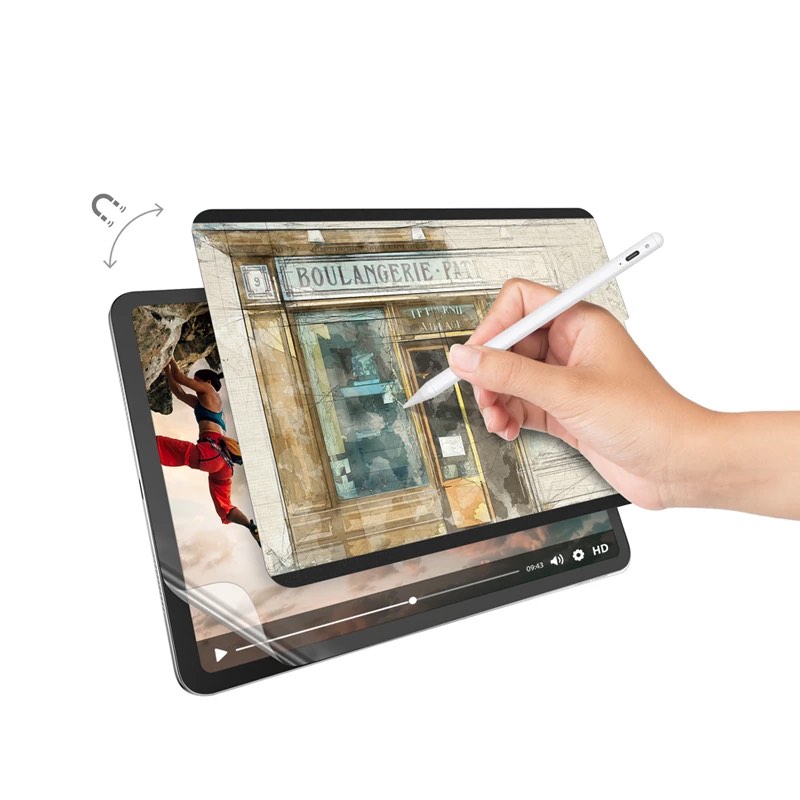 - Магнитното покритие се прикрепва лесно с магнити - без лепило. Просто го поставете върху екрана на вашия iPad и го премахнете когато не желаете. Покритието идва със специално калъфче, в което се съхранява когато не се използва