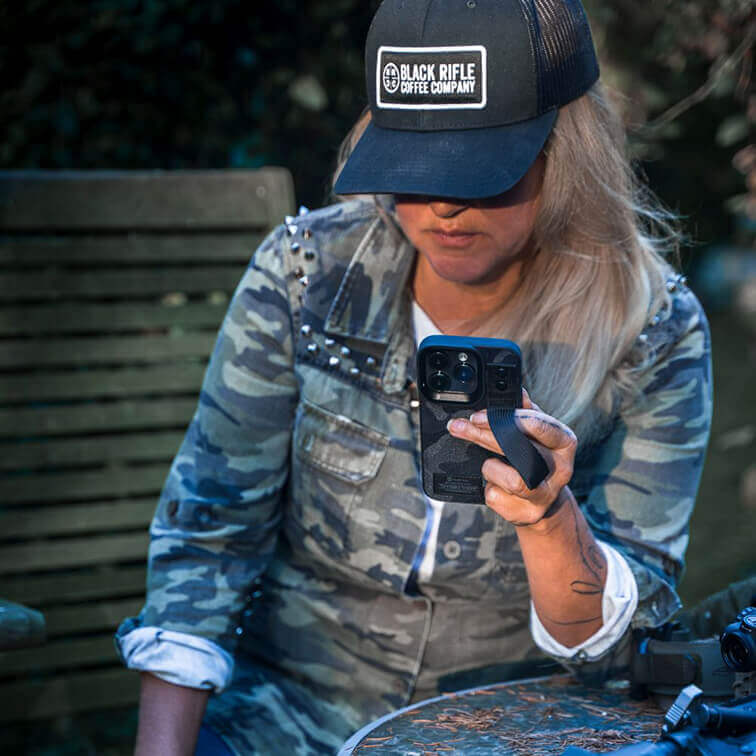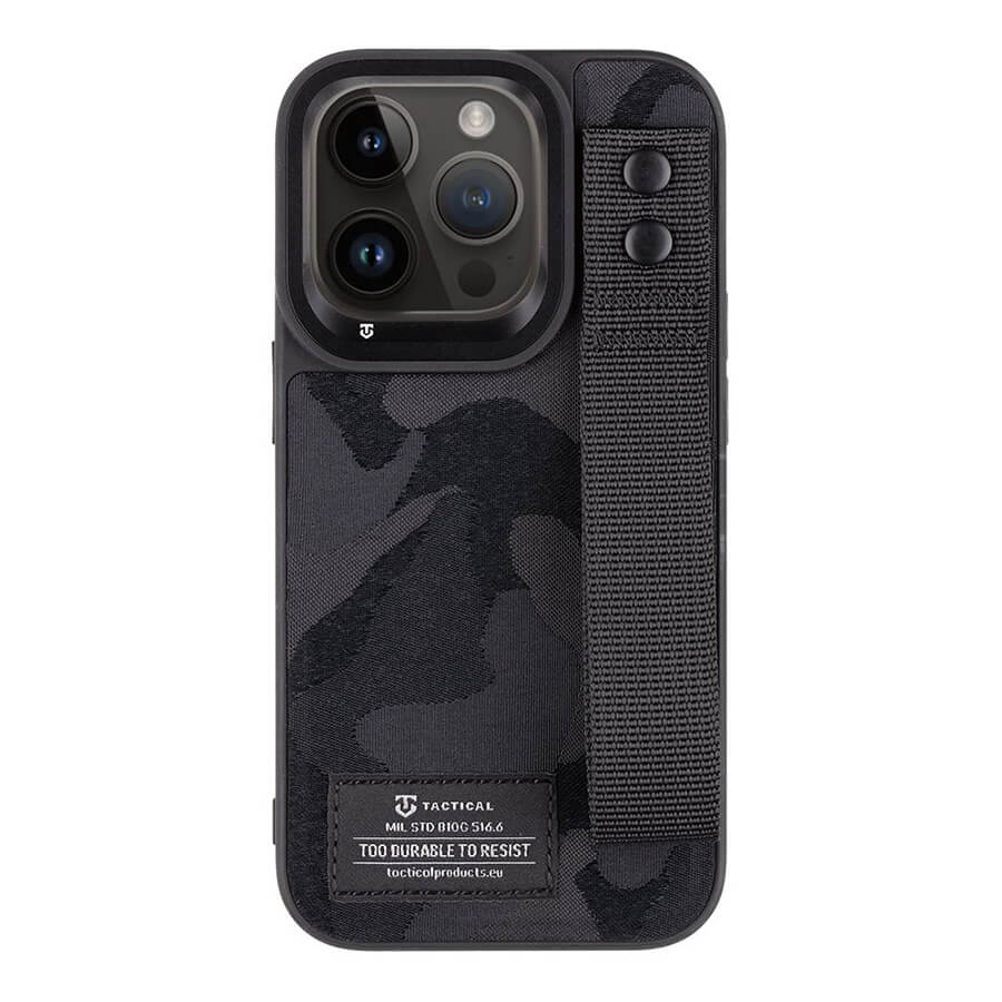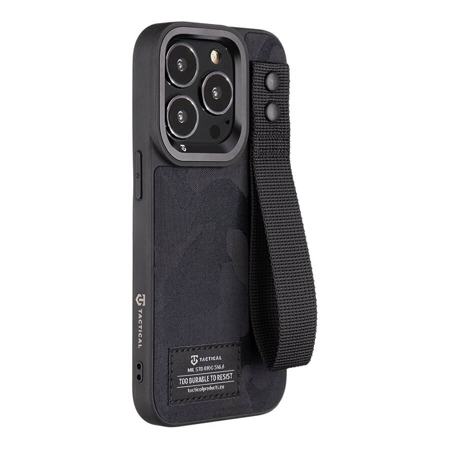 Tactical Camo Troop Cover - хибриден удароустойчив текстилен кейс с лента за ръка за iPhone 14 Pro Max (черен)