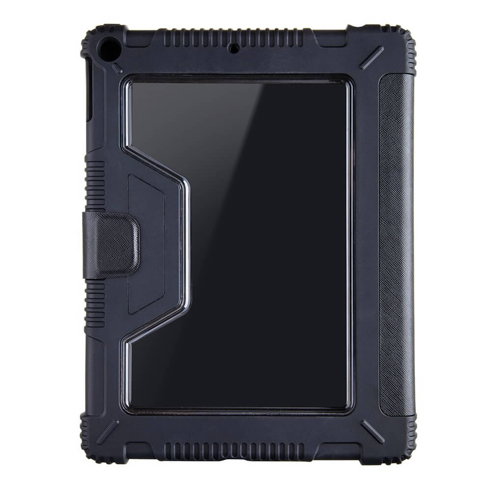 Tactical Riot Shield Case - удароустойчив калъф от изкуствена кожа и поставка за iPad 8 (2020), iPad 7 (2019) (черен)