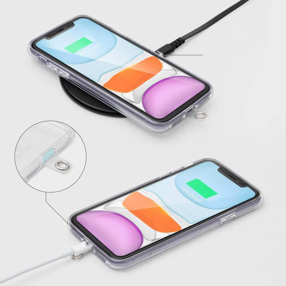 - Просто поставете пластината между кейса и телефона и прокарайте закачащата се част през отвора за зареждане. Прикрепете връзката за врата и сте готови