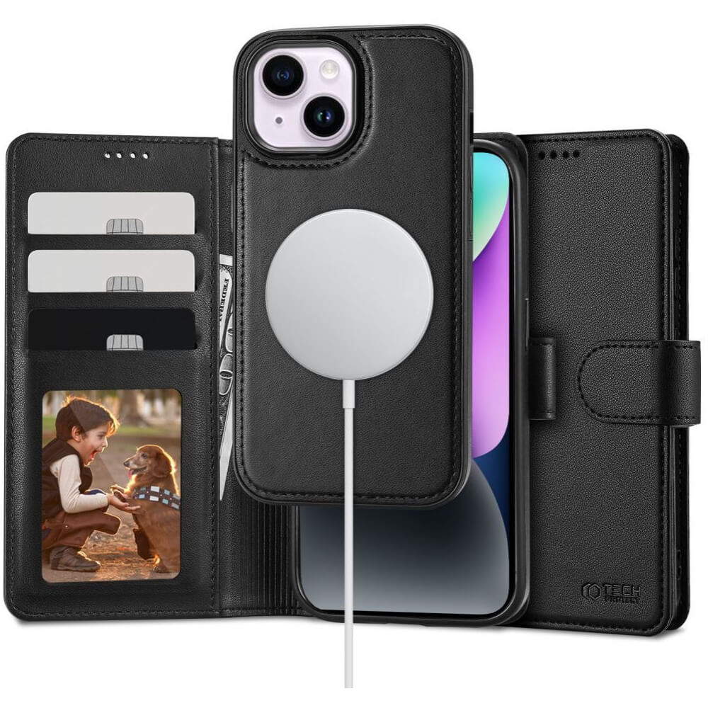 Tech-Protect Wallet Leather MagSafe Flip Case - кожен калъф, тип портфейл с отделящ се кейс с MagSafe за iPhone 15 Plus (черен)