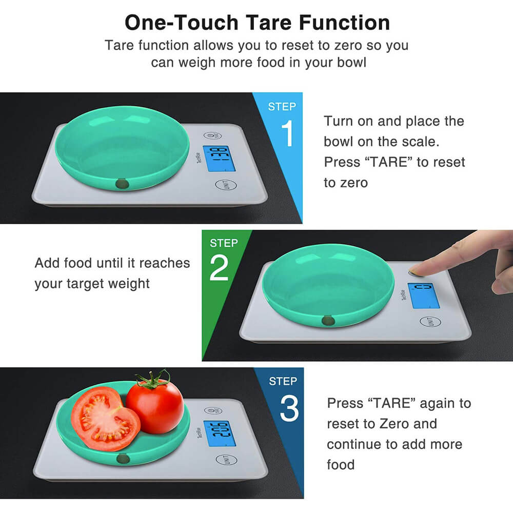 - Възможността за тариране позволява претегляне на теглото на продукта, без да се взема предвид теглото на купата или съда, в който се съхранява