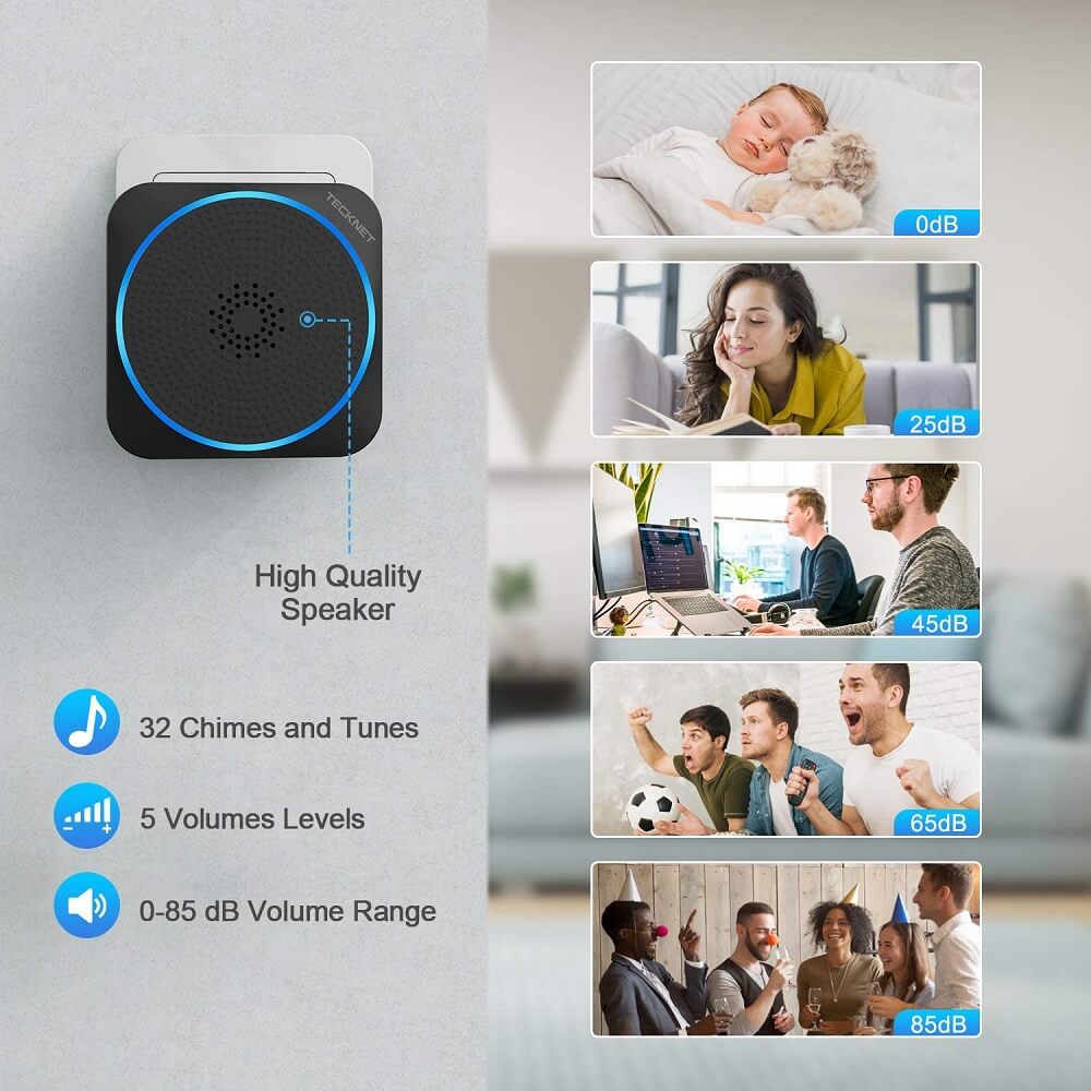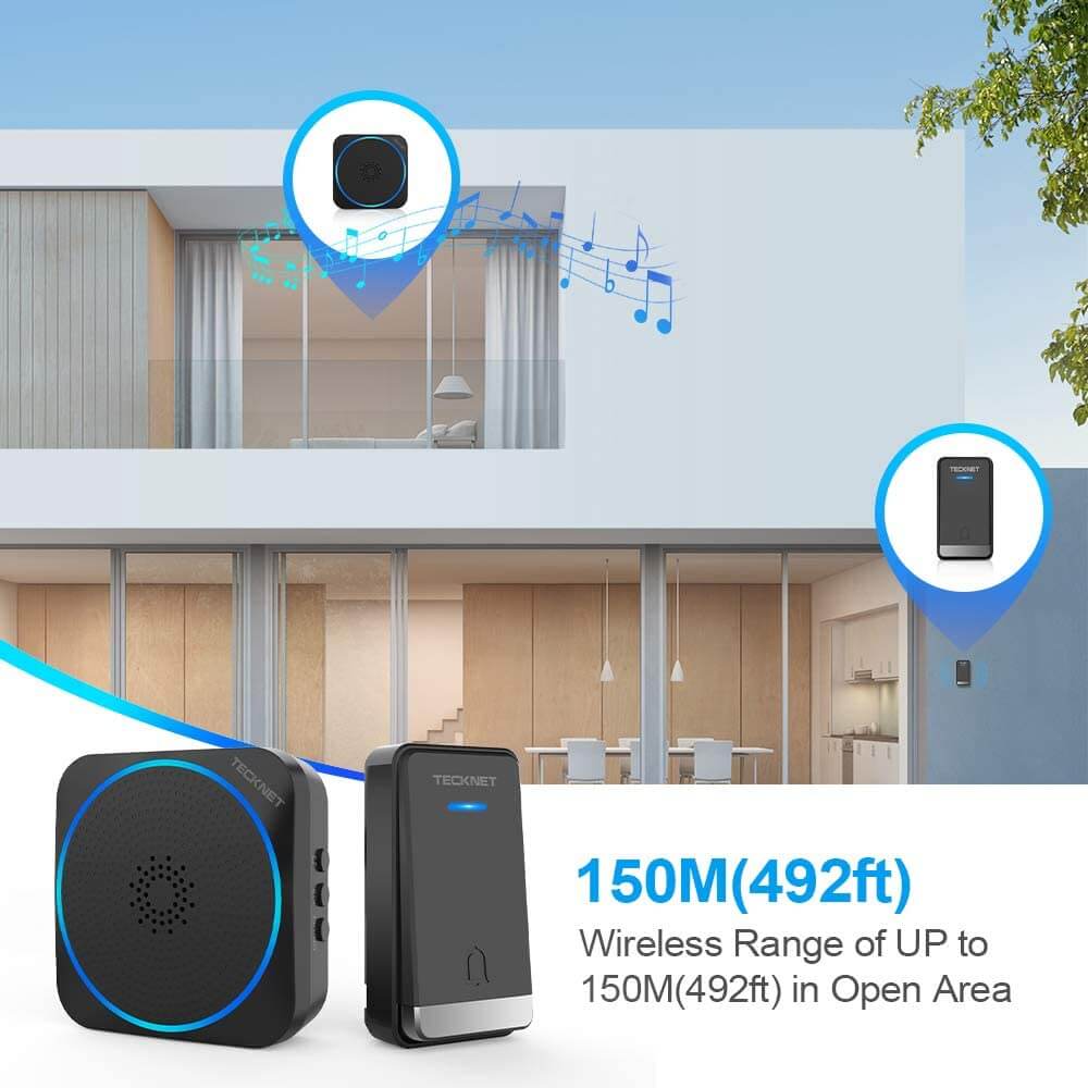 - Безжичният звънец разполага с обхват до 150 м, гарантирайки, че няма да пропуснете посетител, дори ако сте в друга стая или на друг етаж