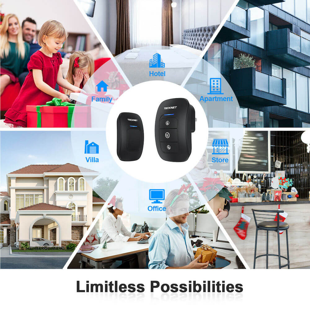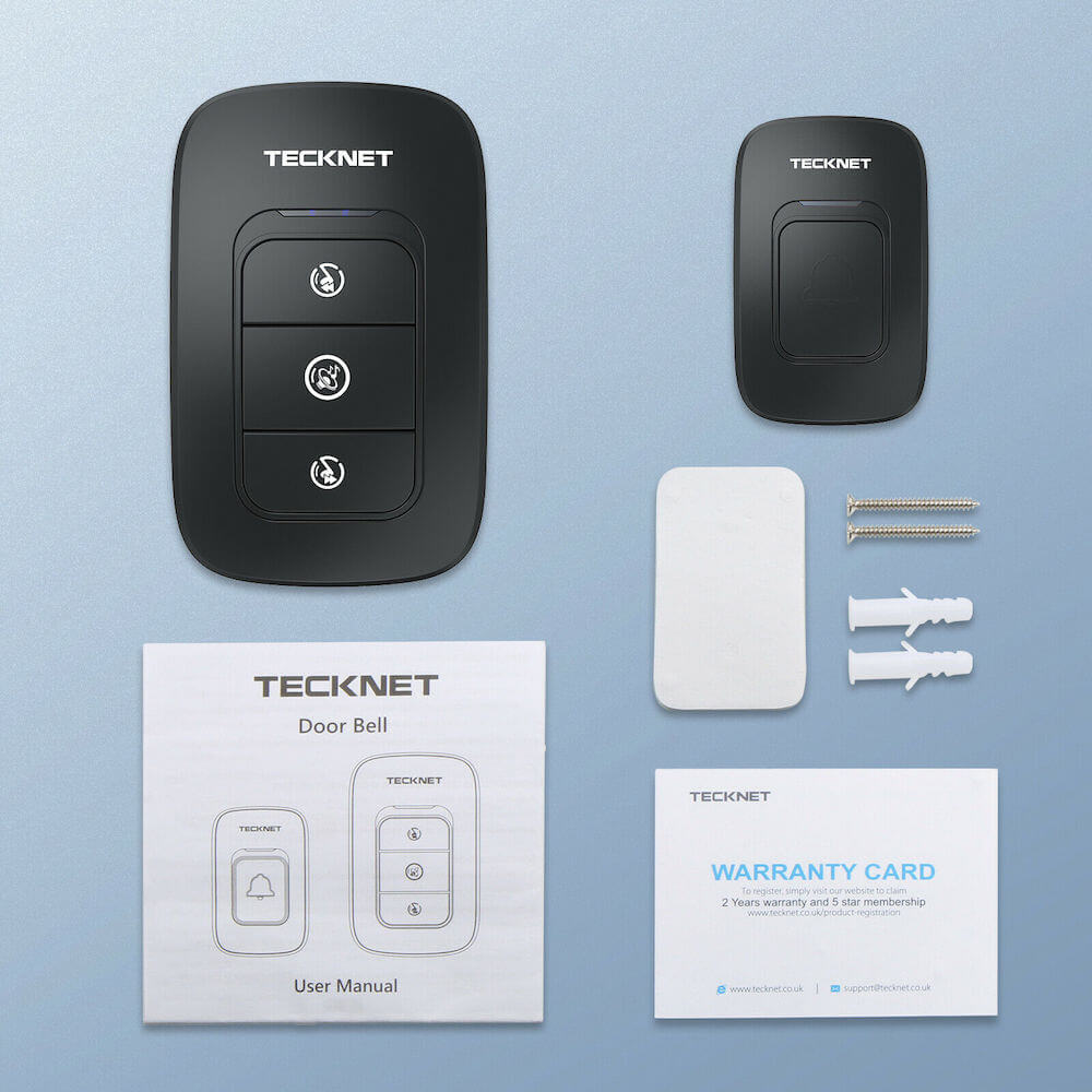 - Tecknet HWD01161 представлява безжичен звънец, разполагащ с 38 мелодии и 4 степени на управление на звука. В комплекта е включен и един предавател, който има обхват на работа до 250 метра. Без значение дали работите вкъщи, готвите в кухнята или сте някъде в двора, вие винаги чувате, когато някой е на входната врата
