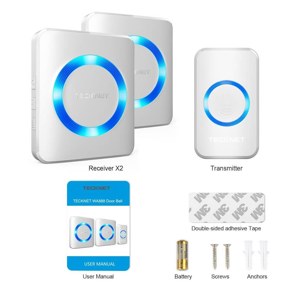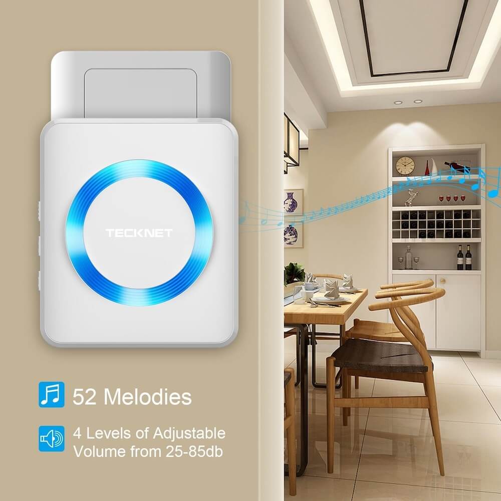 - Tecknet HWD01888 представлява 2 броя безжични звънци, разполагащи с 52 мелодии и 4 степени на управление на звука. В комплекта е включен и един предавател, който има обхват на работа до 300 метра. Без значение дали работите вкъщи, готвите в кухнята или сте някъде в двора, вие винаги чувате, когато някой е на входната врата