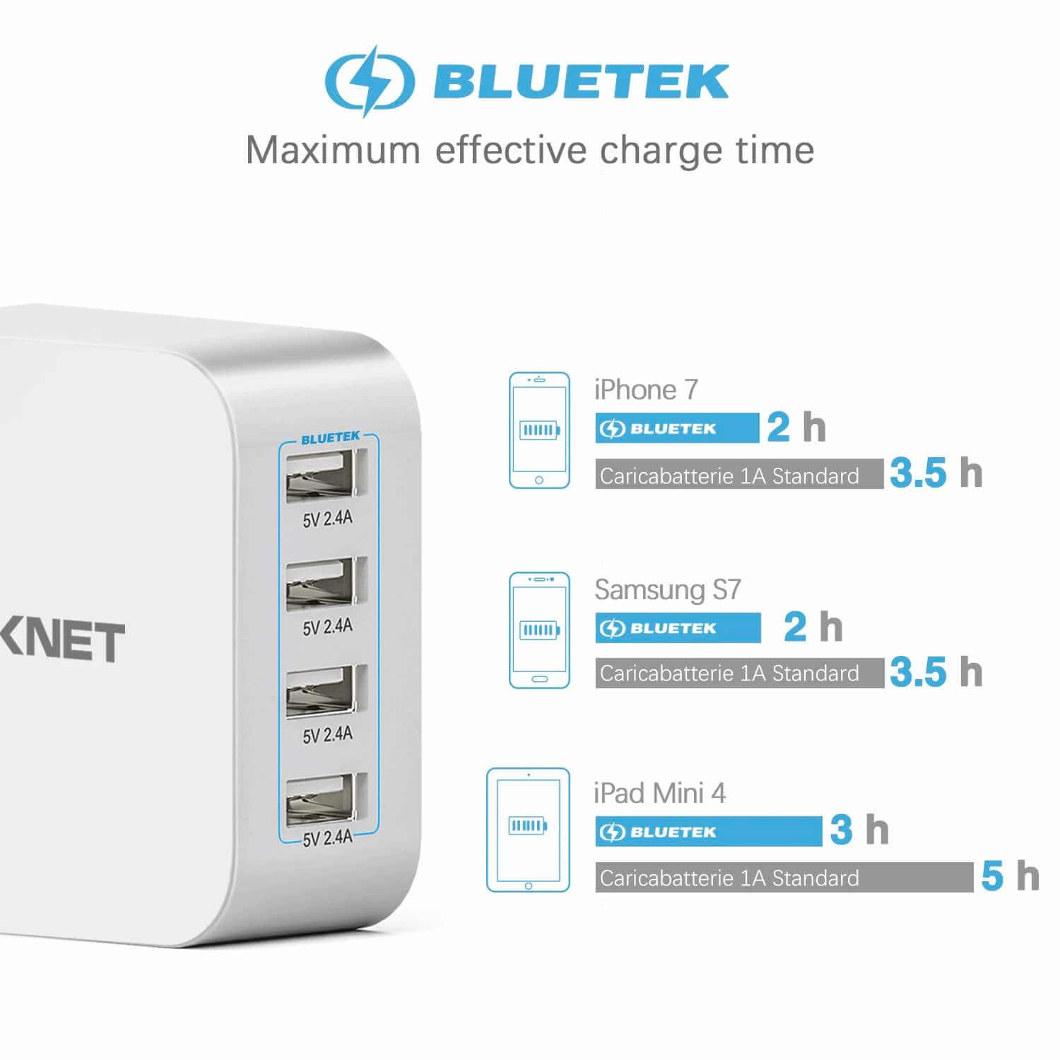 - Иновативната BLUETEK™ технология засича какво е устройството ви и му подава необходимото количество енергия, като го зарежда с оптимална скорост. По този начин се оптимизира зареждането за всяка отделно устройство и се осигурява безопасно зареждане с максимална мощност до 2.4А.
