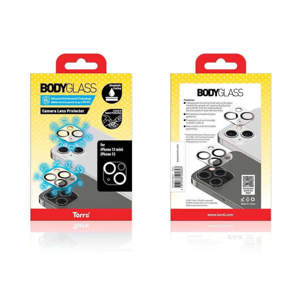 Torrii Bodyglass Anti-Bacterial Camera Lens Protector - предпазно стъклено защитно покритие с антибактериално покритие за камерата на iPhone 13, iPhone 13 mini (прозрачен)
