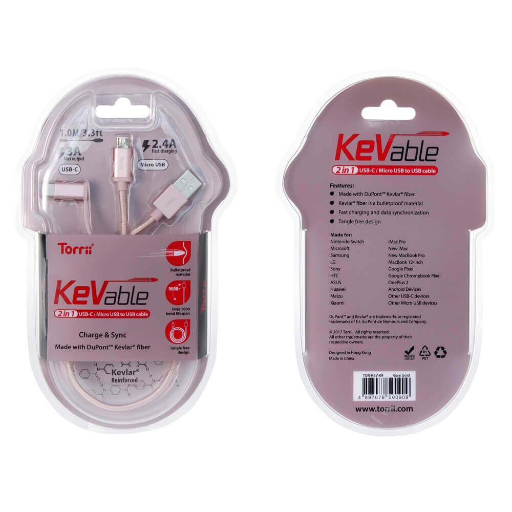 Torrii KeVable 2-in-1 Universal USB Cable (1 meter) - изключително здрав кевларен кабел за устройства с microUSB и USB-C (1 метър) (розово злато)
