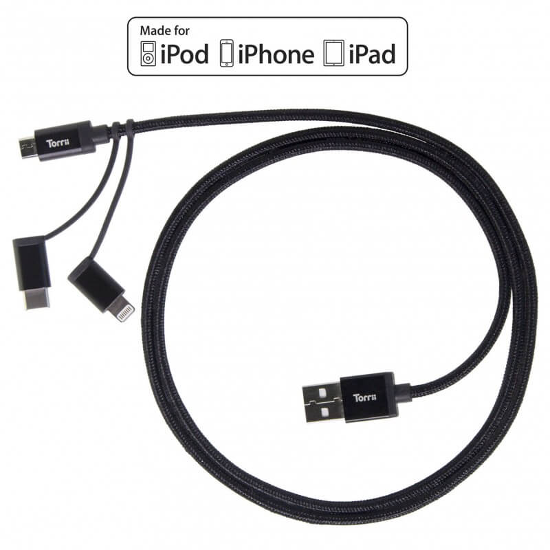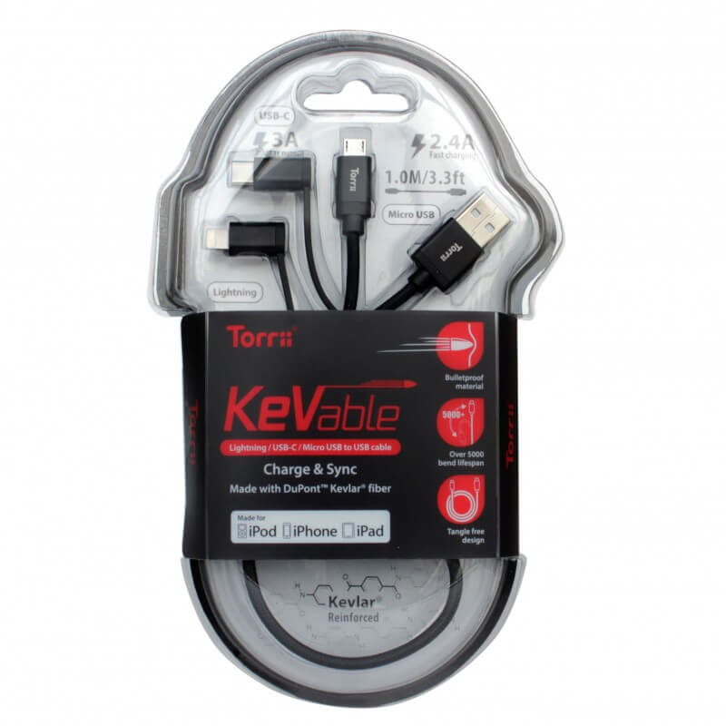 Torrii KeVable 3-in-1 Universal USB Cable (1 meter) - изключително здрав кевларен кабел за iPhone, iPad, iPod с Lightning, устройства с microUSB и USB-C (1 метър) (черен)