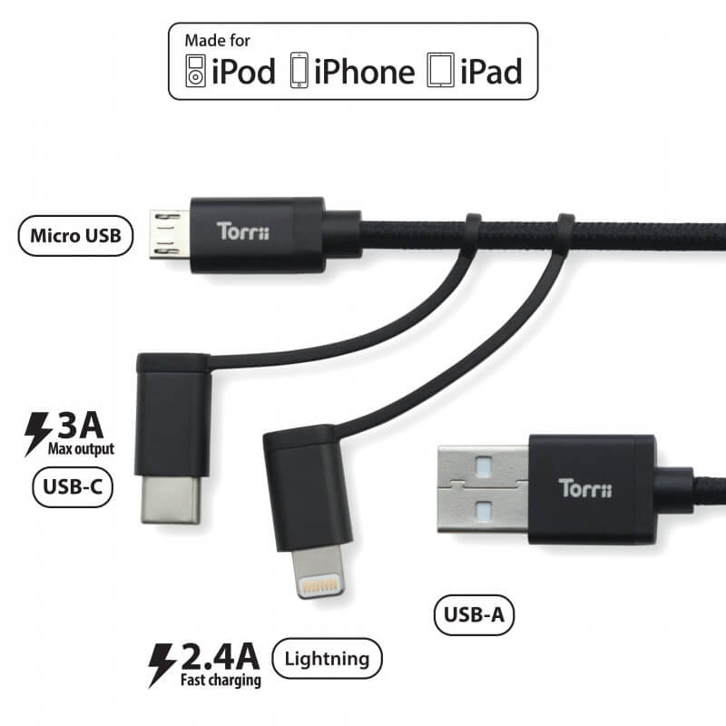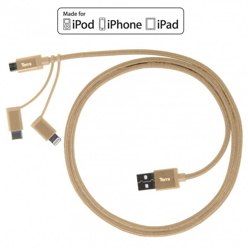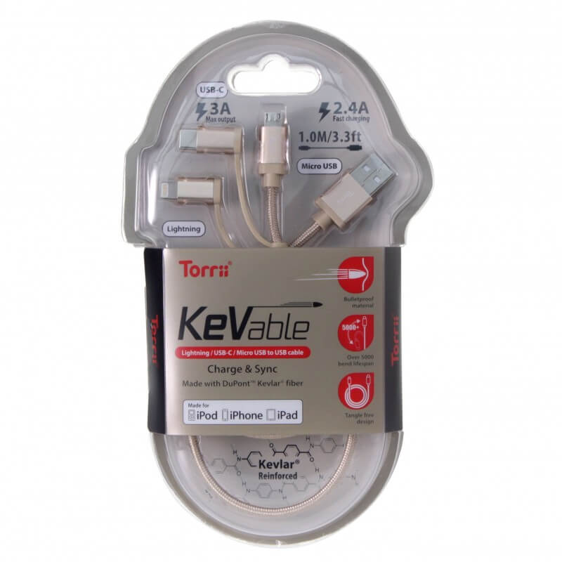 Torrii KeVable 3-in-1 Universal USB Cable (1 meter) - изключително здрав кевларен кабел за iPhone, iPad, iPod с Lightning, устройства с microUSB и USB-C (1 метър) (златист)