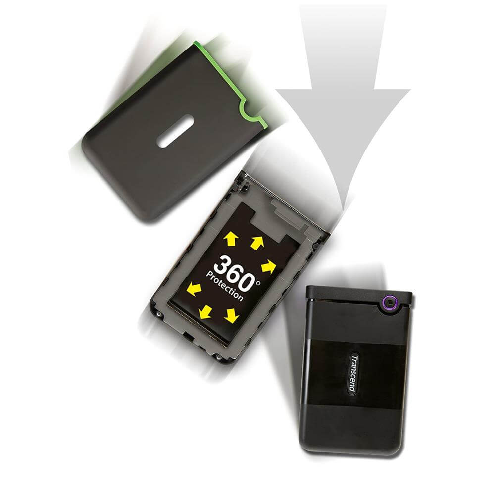 - StoreJet 25M3G е изработен от трислойна защита, която дори надвишава военни стандарти за здравина. Корпусът е съставен от силиконова (термополиуретанова) обвивка, вътрешен амортисьор за обиране на вибрациите и ударите при удар, изпускане и др. и подсилена твърда обвивка