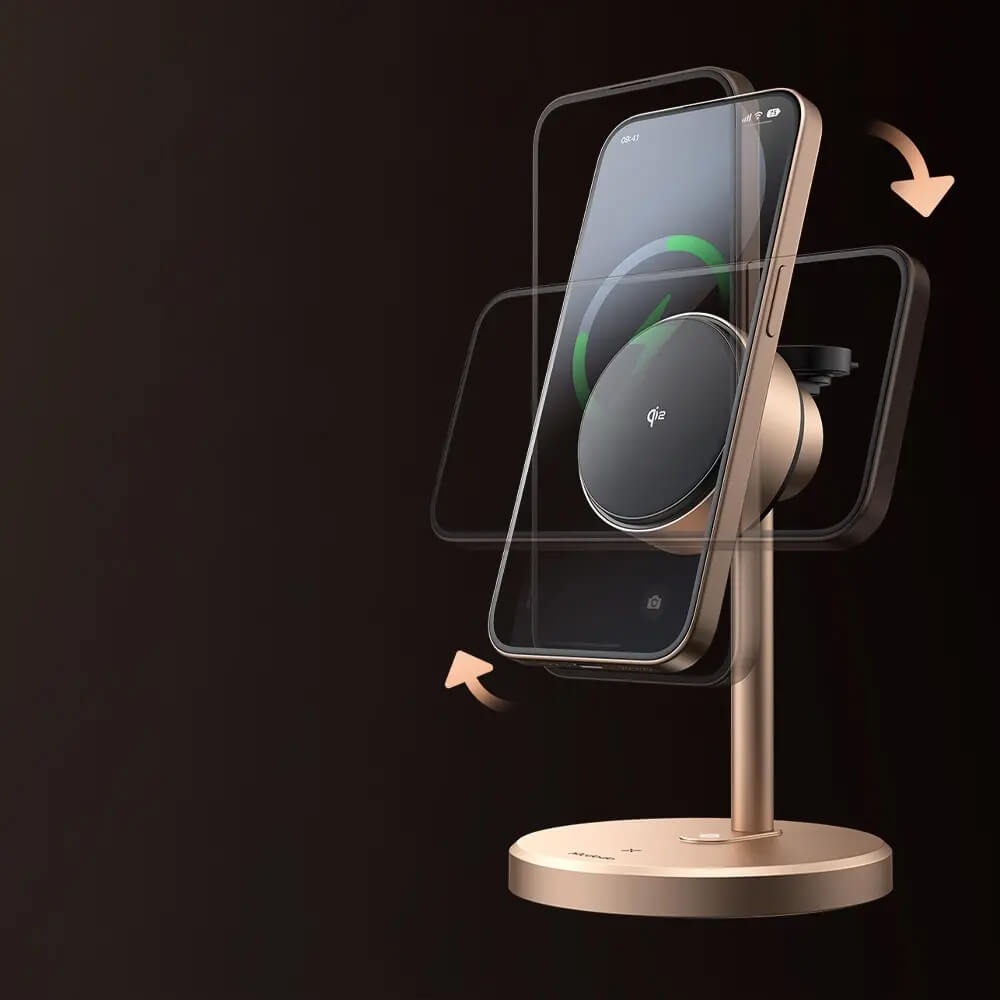 - Магнитна MagSafe поставка с вграден модул за безжично зареждане - бързо зарежда вашия iPhone с MagSafe или устройство с Qi2, с мощност до 15W, чрез удобната му магнитна връзка, която се прикрепя към вашия смартфон