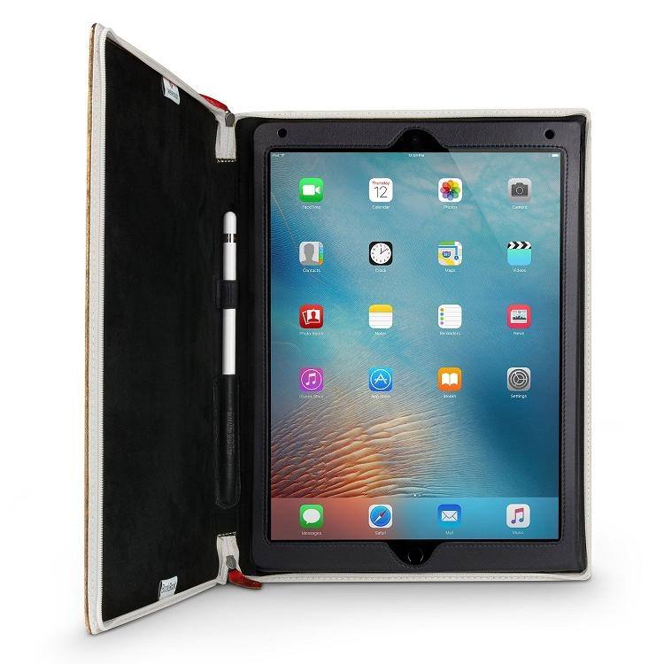 § Луксозния кожен калъф, наподобяващ старинна книга може да се ползва по два начина – като слийв, където вадиш и поставяш Apple iPad Pro 12.9 и го затваряш с ципа или като кейс, където в 4-те края лаптопа се захваща със специални еластични ленти и позволява да ползваш Apple iPad Pro 12.9 докато е в калъфа