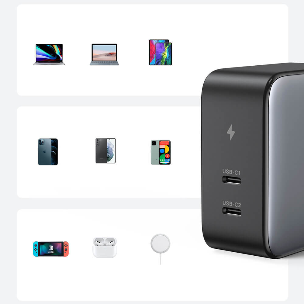 - Захранване за ел. мрежа с два USB-C изхода с PD 3.0 протокол за бързо зареждане