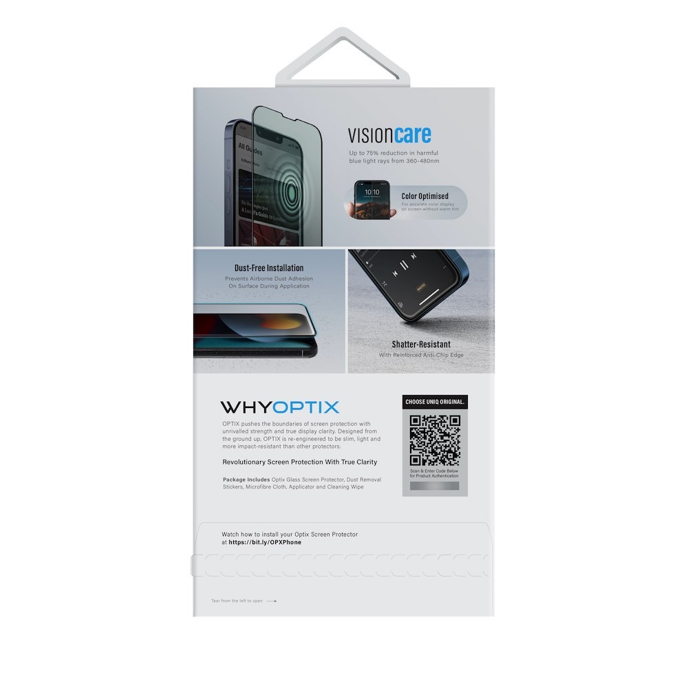 Uniq Optix VisionCare Tempered Glass with Anti Blue Light - калено стъклено защитно покритие със защитен филтър за дисплея на iPhone 14, iPhone 13, iPhone 13 Pro (черен-прозрачен)
