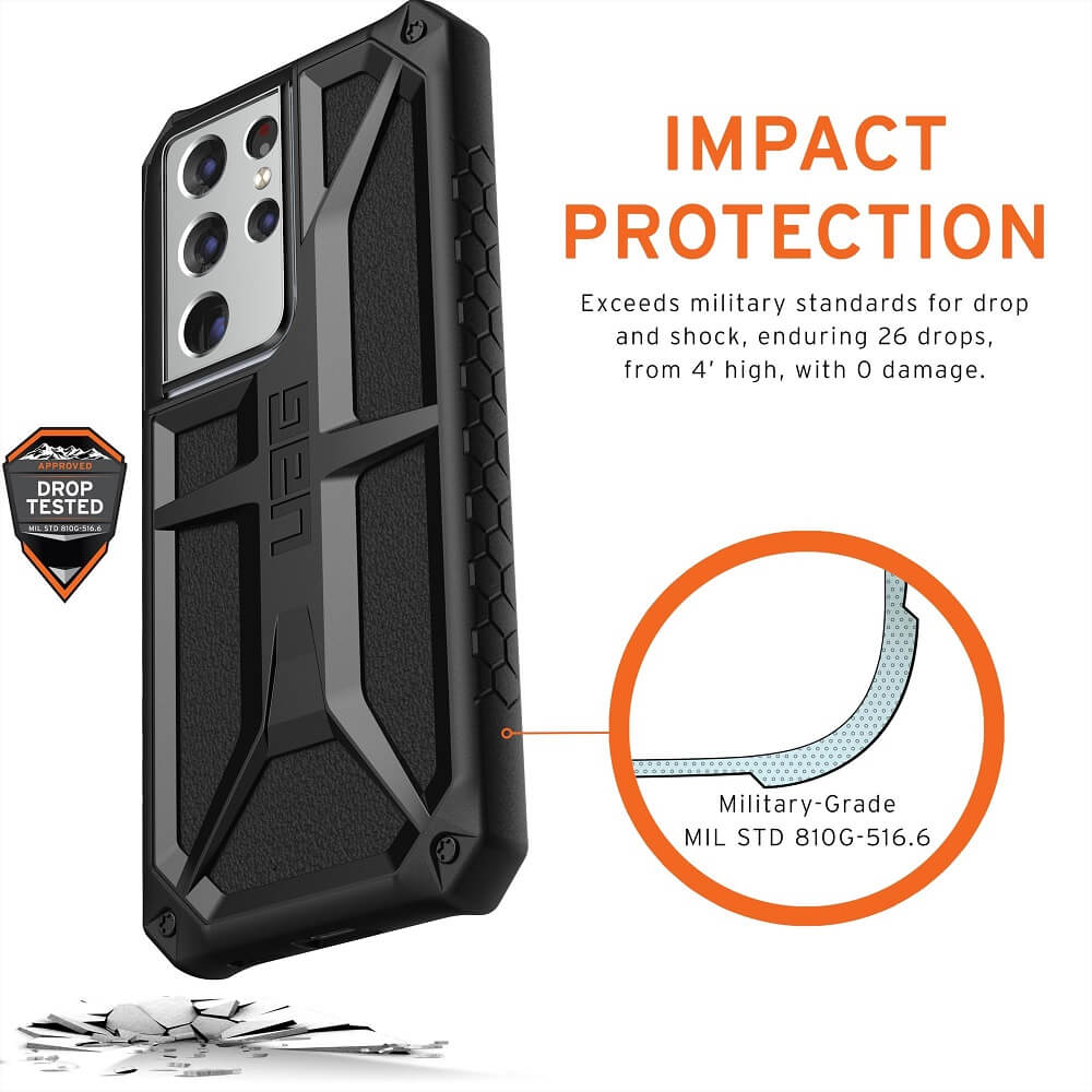 - Серията Monarch на Urban Armor за Galaxy S21 Ultra, съчетава в себе си уникален дизайн и прецизна изработка, за да покрие дори двойно, военните изисквания за защита при изпускане или случайно падане