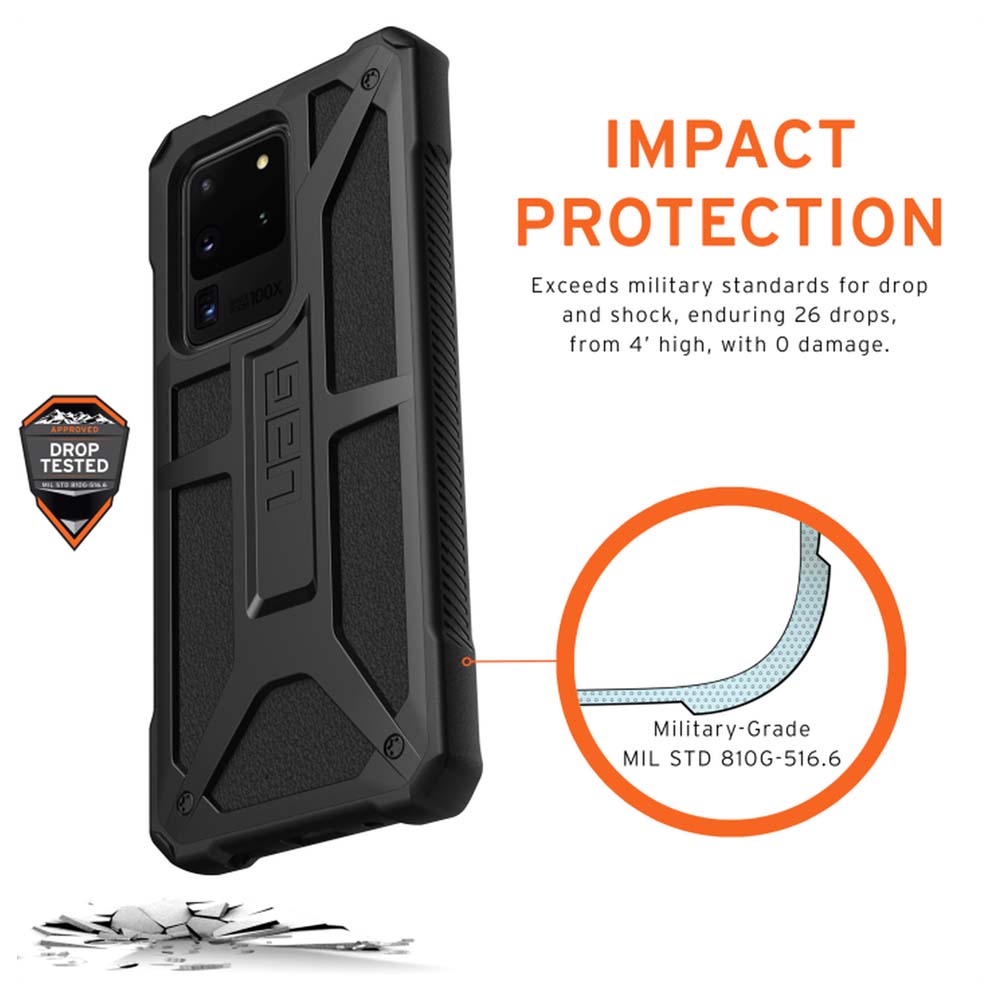 - Серията Monarch на Urban Armor за Galaxy S20 Ultra, съчетава в себе си уникален дизайн и прецизна изработка, за да покрие дори двойно, военните изисквания за защита при изпускане или случайно падане