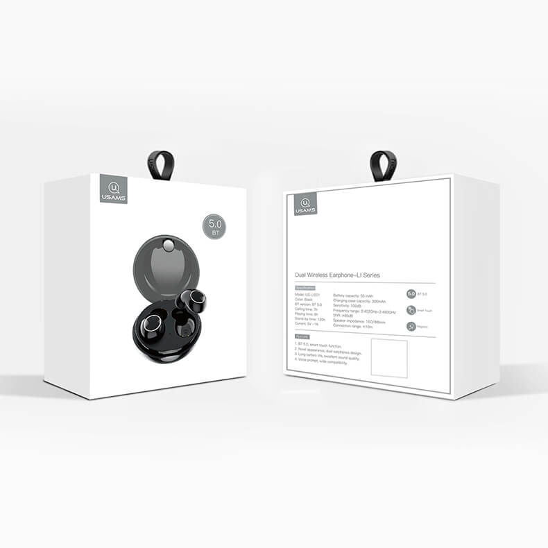 - 1 x USAMS LI Dual Stereo TWS Earbuds - 1 x зареждащ кейс - 1 x MicroUSB кабел - 2 х силиконов тапи за ухо - 1 х ръководство