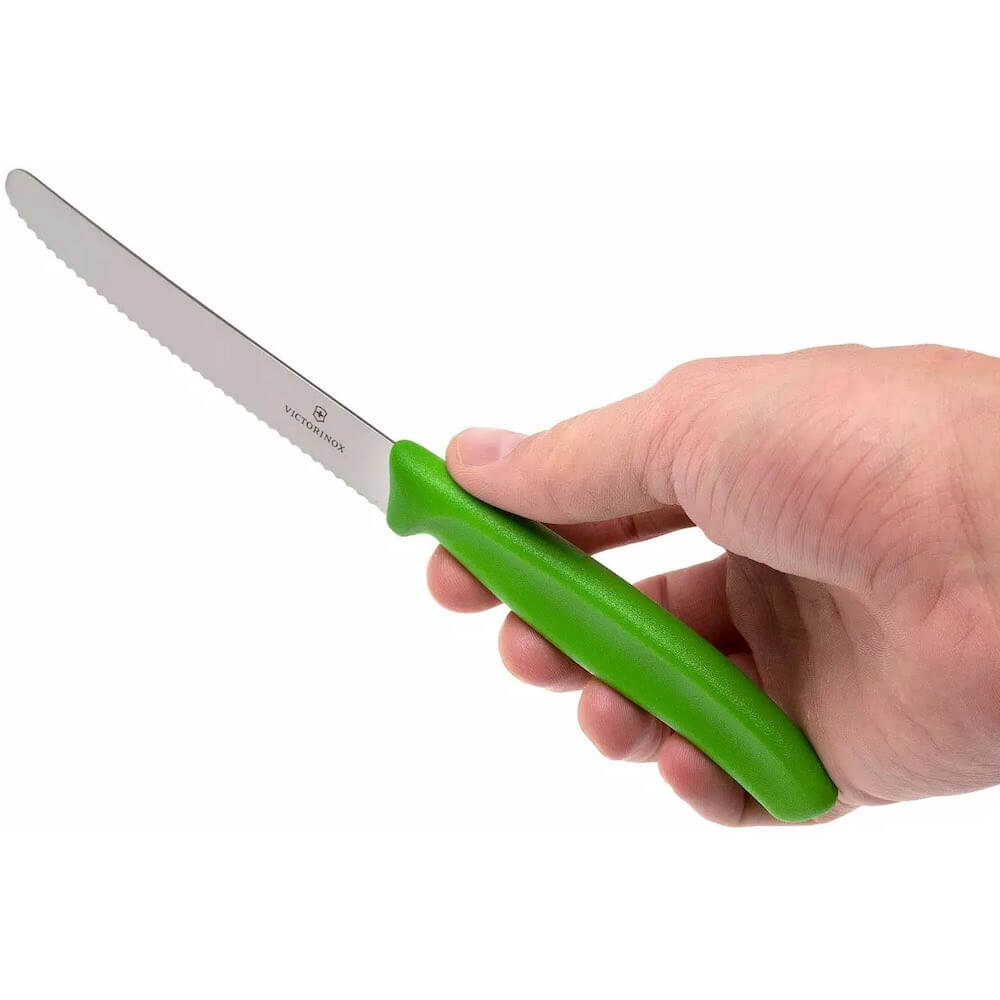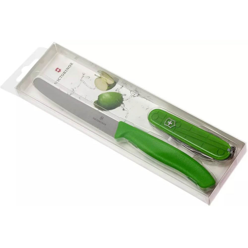 - Комплектът от два ножа Victorinox е изработен от най-висококачествени материали. Остриетата, изработени от висококачествена неръждаема стомана, осигуряват прецизно рязане и висока издръжливост. Включва един назъбен нож с 11 см острие и един мултифункционален швейцарски нож с 12 разлизни функции