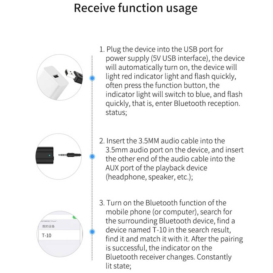 - Режим на приемане: безжично поточно предаване чрез Bluetooth връзка на аудио сигнал от вашите устройства (телевизори, домашни стерео системи, усилватели, CD плейъри и др.) към слушалки или високоговорители, които поддържат Bluetooth