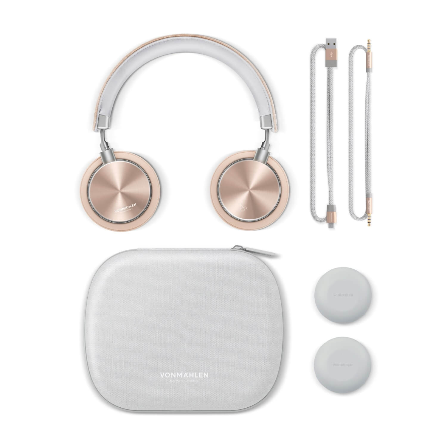 - Vonmahlen Wireless Concert One Headphones - кейс за съхранение - microUSB кабел - 3.5 mm аудио кабел - ръководство
