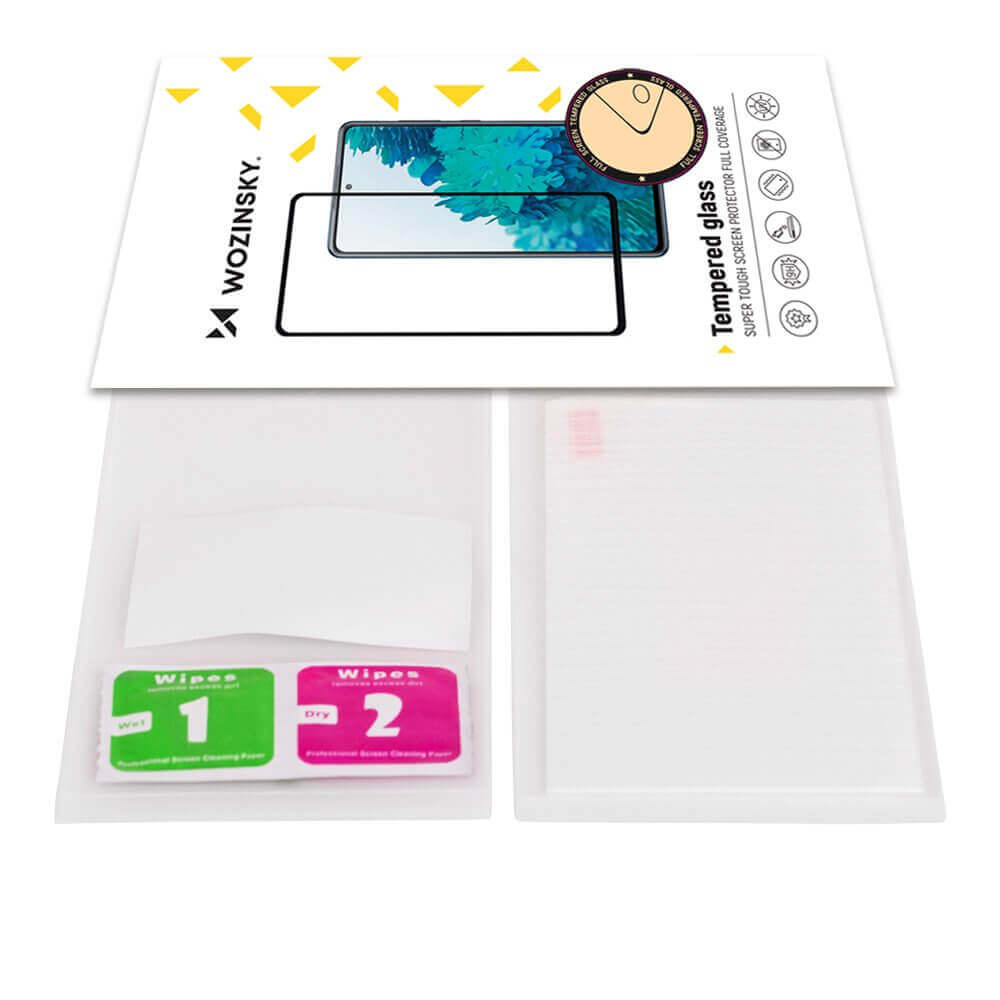 - 1 х Wozinsky Full Glue 3D Tempered Glass - 1 x микрофибърна кърпичка - 1 х мокра кърпичка - 1 х антистатична лепенка за премахване на прашинки