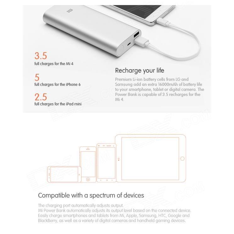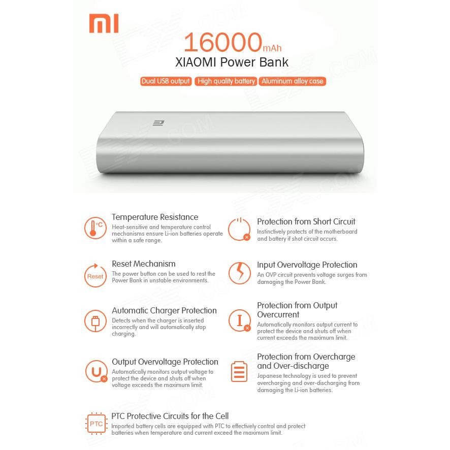 Xiaomi Power Bank 16000 mAh - външна батерия с 2 USB изходa за мобилни телефони и таблети (сребрист)