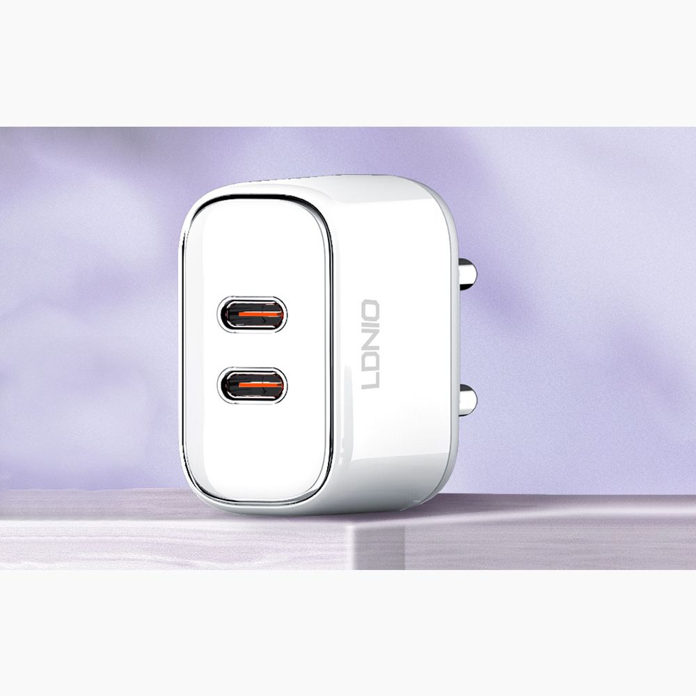 Захранване за ел. мрежа с 2xUSB-C изходи и USB-C към Lightning кабел - LDNIO Wall Charger 2xUSB-C 35W (бял)