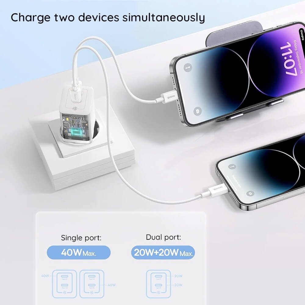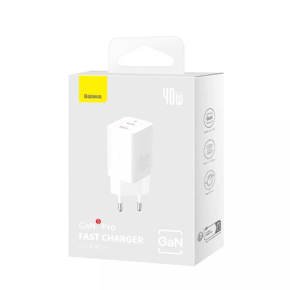 - В комплекта: 1 х Baseus GaN5 Pro Fast Wall Charger Dual USB-C 40W