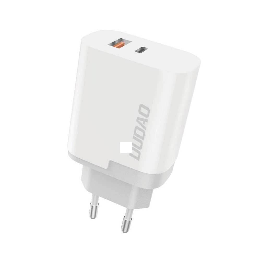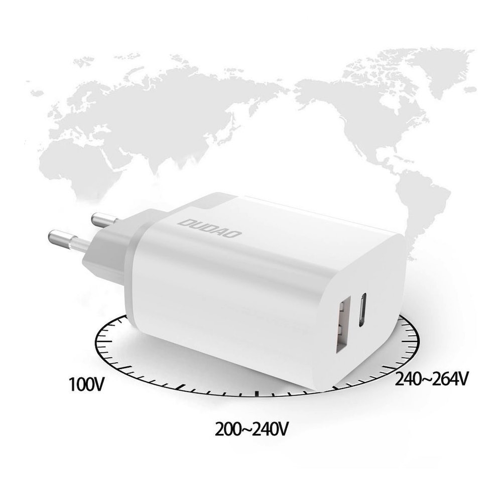 Захранване за ел. мрежа с USB-A и USB-C изходи и технология за бързо зареждане - Dudao Dual Travel Fast Wall Charger 22.5W (бял)