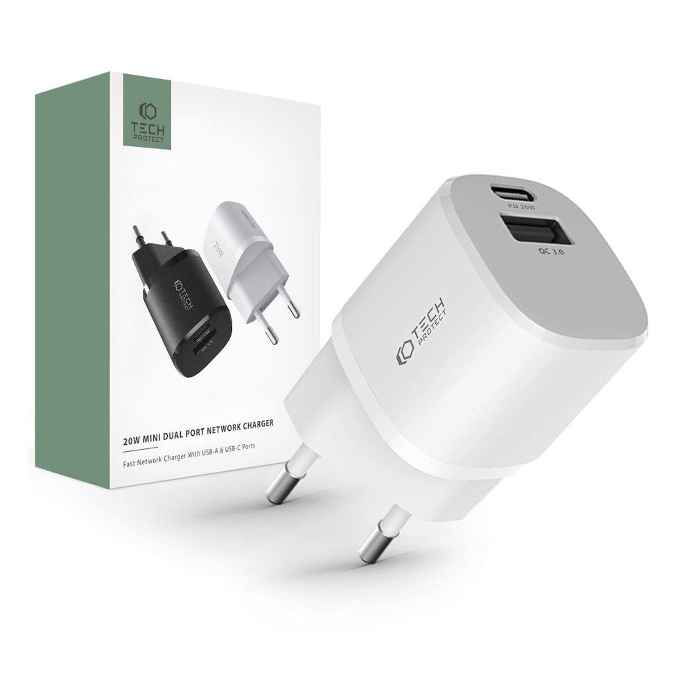 Захранване за ел. мрежа с USB-A и USB-C изходи и технология за бързо зареждане - Tech-Protect C20W Mini Fast Wall Charger 20W (бял)