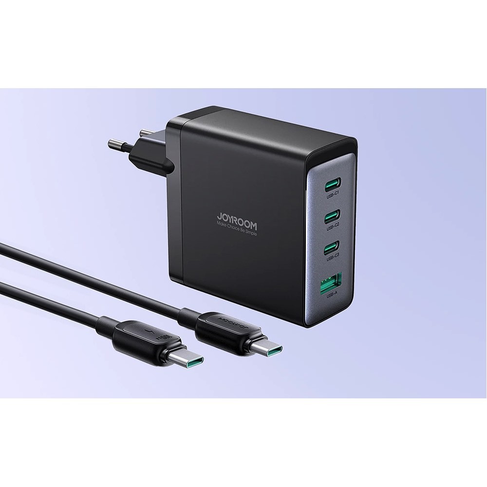 Захранване за ел. мрежа за лаптопи, смартфони и таблети с 1xUSB-A и 3xUSB-C изходи с технология за бързо зареждане и USB-C кабел - Joyroom GaN Fast Wall Charger 100W (черен)