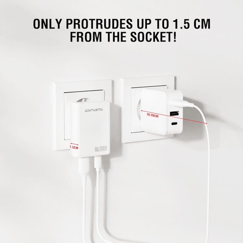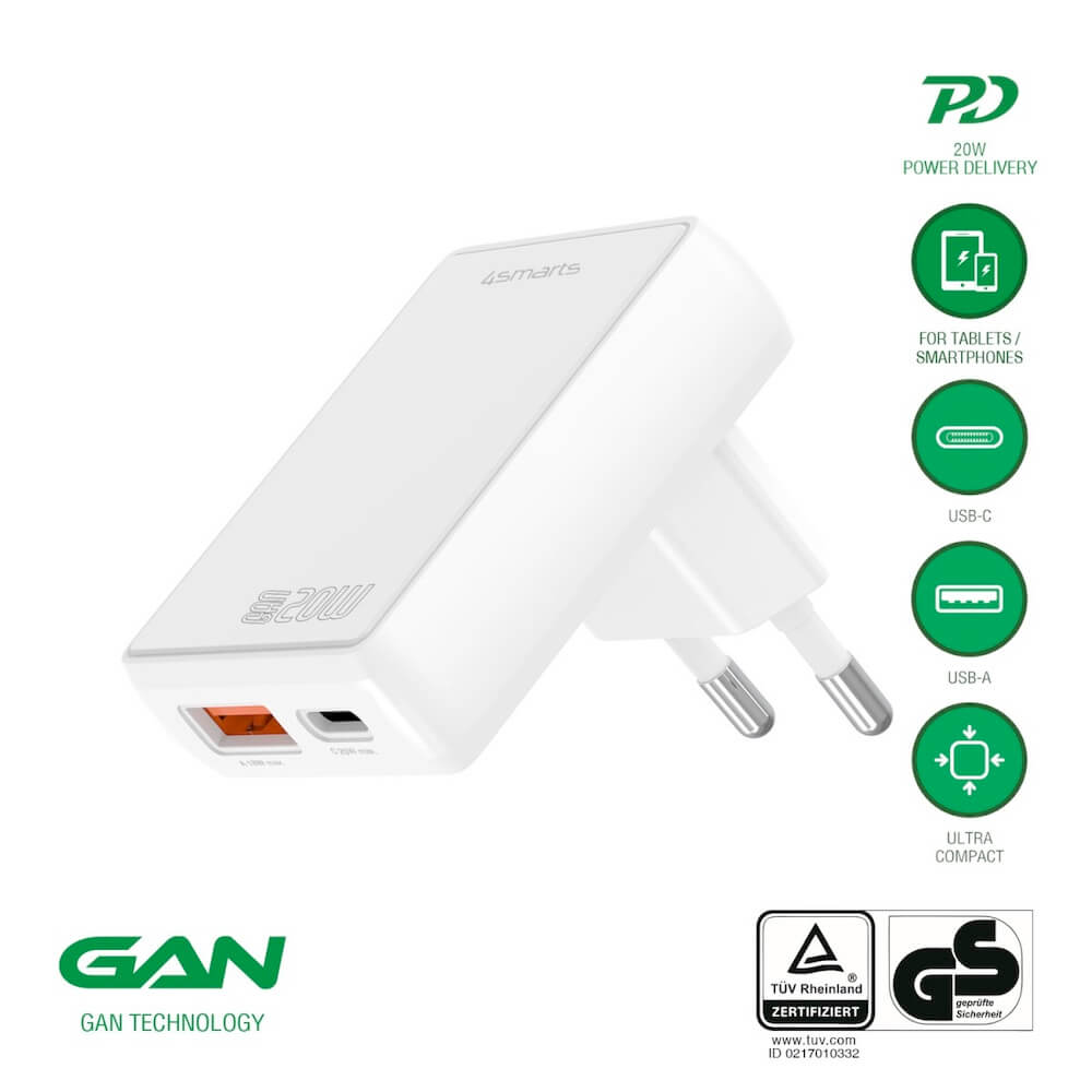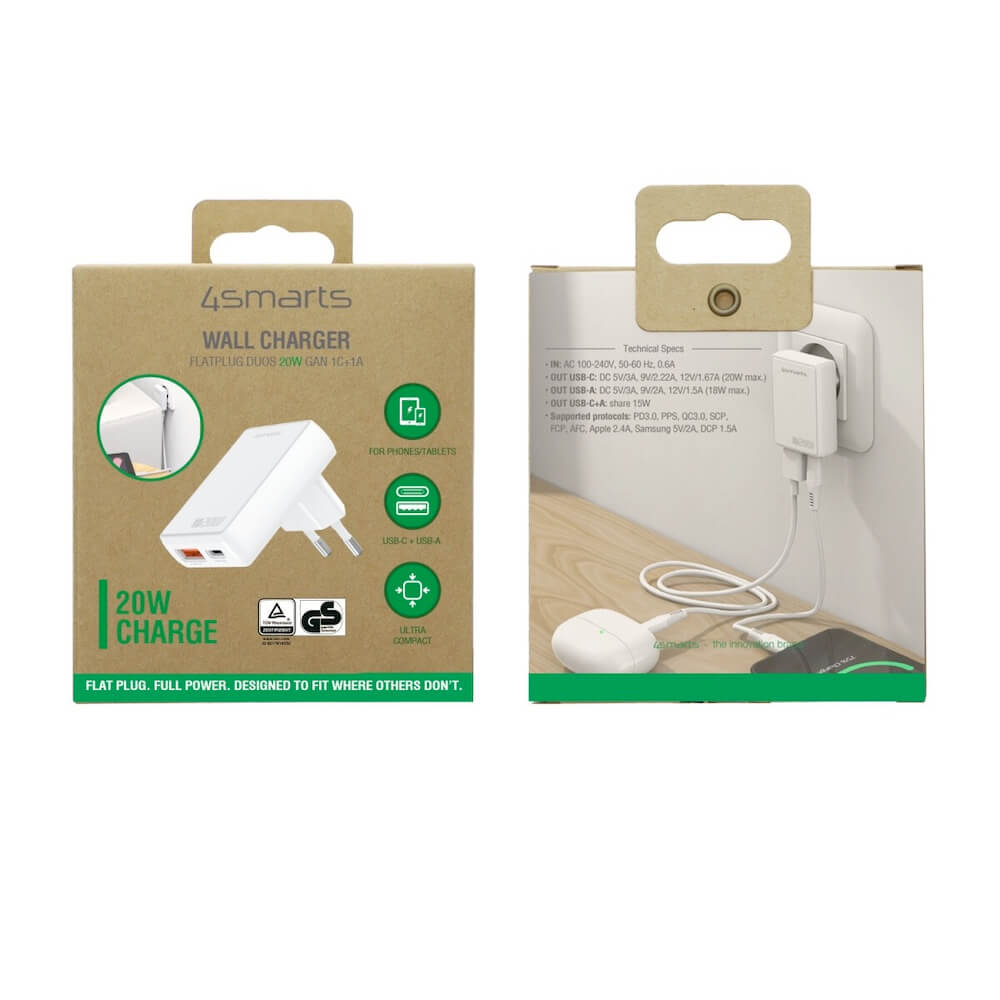 - В комплекта: 1 x 4smarts GaN Wall Charger FlatPlug Duos 20W