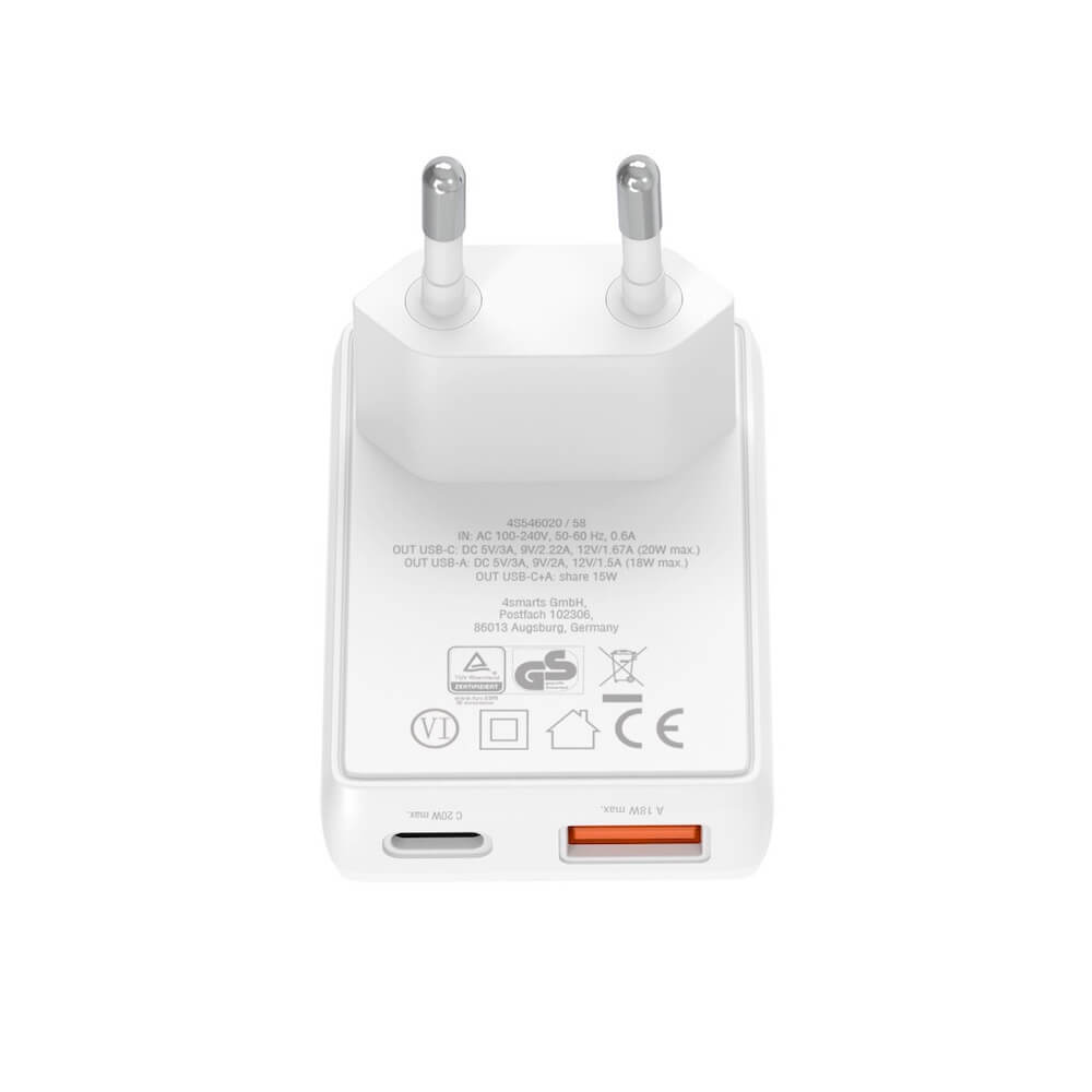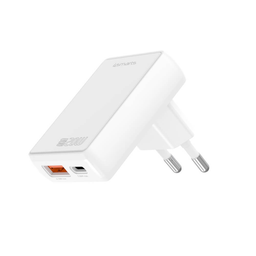 Захранване за ел. мрежа за мобилни устройства с USB-A и USB-C изходи и с технология за бързо зареждане - 4smarts GaN latPlug Duos 20W Wall Charger (бял)